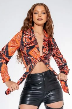 The AKIRA Label Aesthetic Scarf Print Tie Front Blouse is made from a sheer, lightweight fabrication and features an artsy scarf print, a plunging neckline, long sleeves with buttoned cuffs, a tie waist detail, and a snap button front closure. Pair this piece with the matching AKIRA Label Aesthetic Scarf Print Maxi Skirt to complete your graphic look.