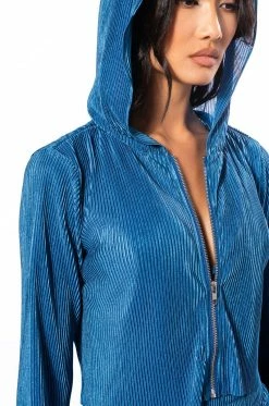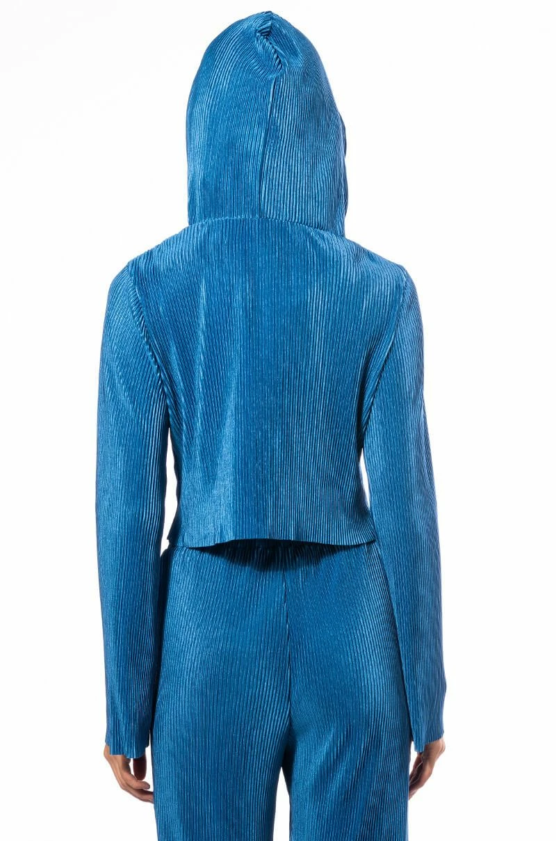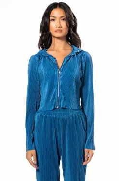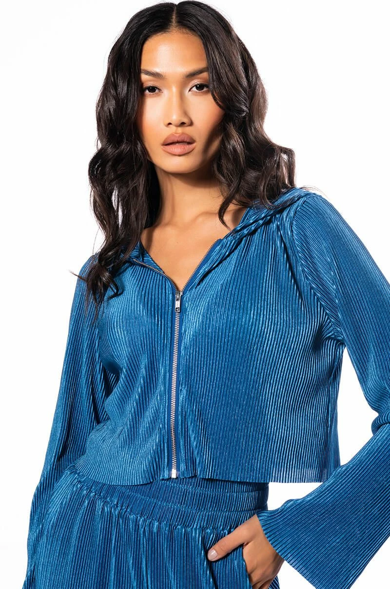 The ASTRID Pleated Front Zip Hoodie features a luxe pleated fabrication, a slightly cropped cut, long sleeves, an attached hood, and a front zipper closure. Pair with the coordinating AKIRA Label Astrid Pleated Bralette and Astrid Pleated Palazzo Pant for a complete look.