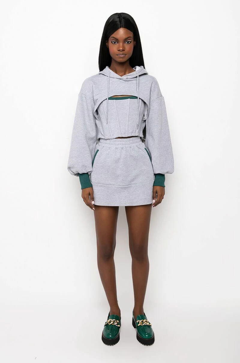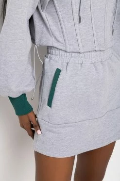 The AKIRA Label Beam Me Up Mini Skirt features a soft sweatshirt material base, a smocked elasticized waistband,a mini length, and slant side pockets. Complete your look with the coordinating Beam Me Up Corset Detail Cutout Sweatshirt.