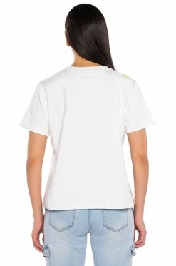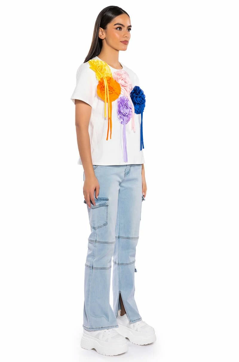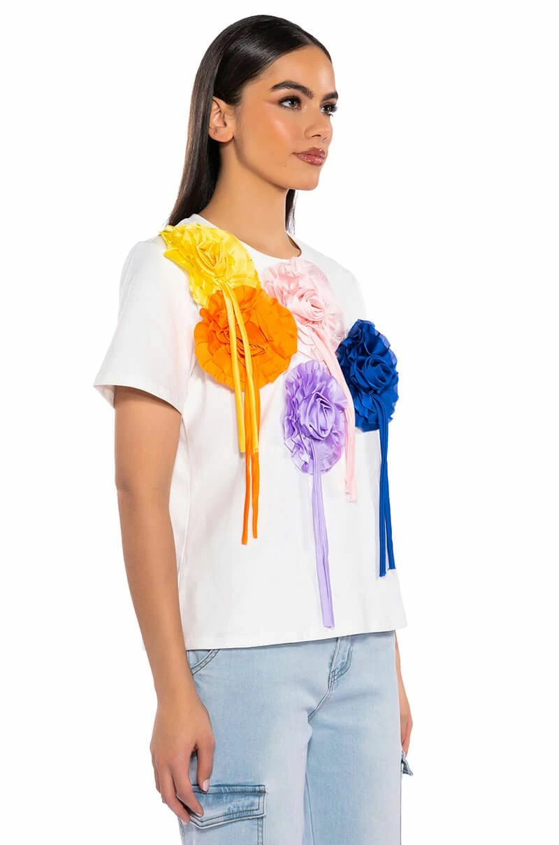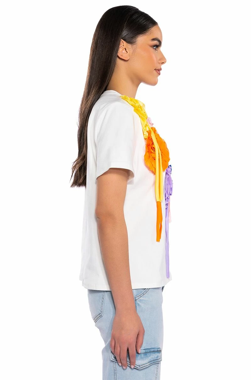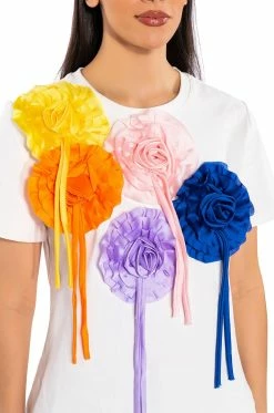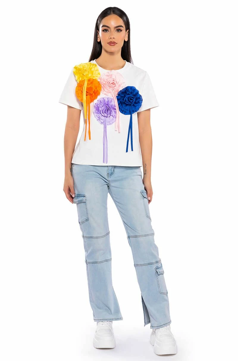 Spring has sprung with The AKIRA Label Bouquet Of Flowers Fabric Detail Shirt! This soft and stretchy top is made from a cotton blend base fabrication and features a crew neckline, boxy short sleeves, an oversized fit, and 3D flower detailing with colorful satiny petals and stems. Style with a bold headband, straight leg denim, and chunky loafers.