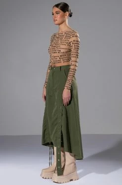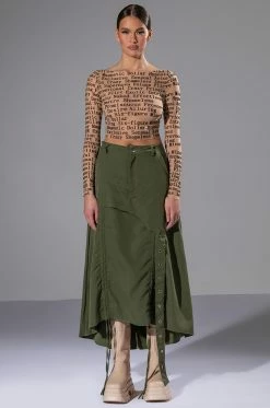 The AKIRA Label Bow Down Mesh Long Sleeve Top features a sheer mesh fabrication, a boat neckline, a long sleeve silhouette, a cropped cut, and alluring adjectives embossed in velvet across the front. Layer this piece over bodysuits or bralettes to add some graphic appeal to your look.