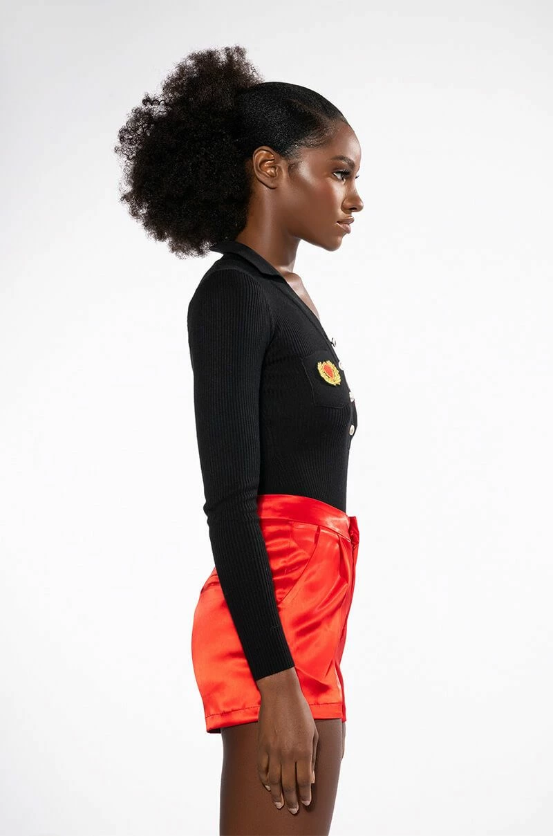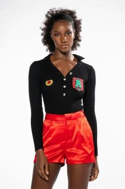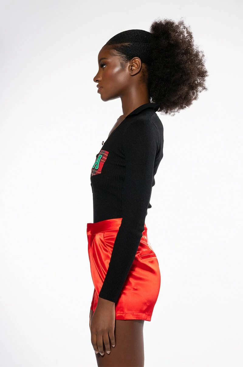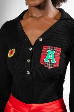 The AKIRA Label Collegiate Study Hall Long Sleeve Button Down Bodysuit features a ribbed knit base, long sleeves, a button front collared neckline and dual chest pockets. Complete with collegiate-inspired patch detailing and a cheeky cut bottom with snap button gusset. Wear with your favorite high waisted leather leggings or a pleated skirt.