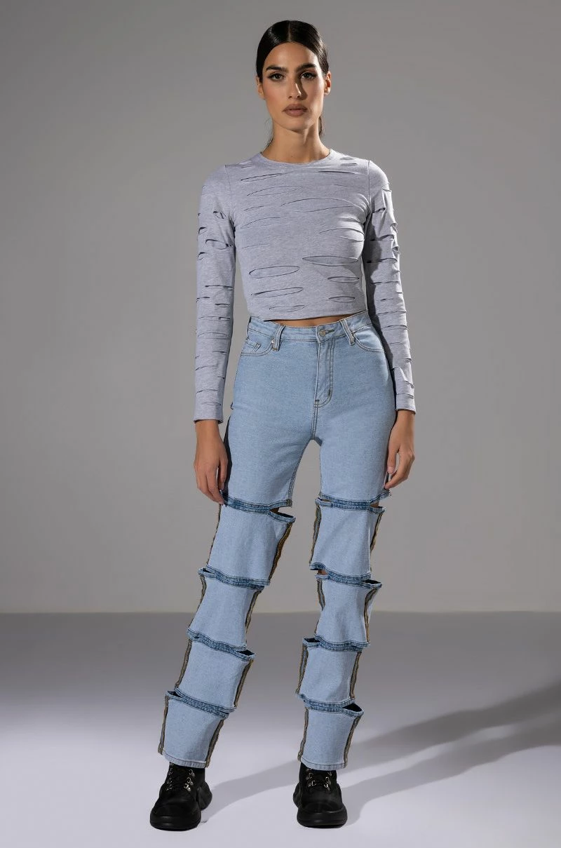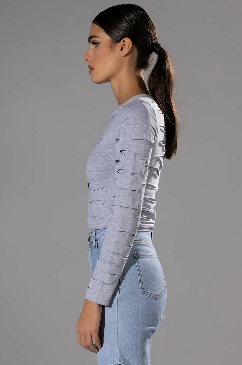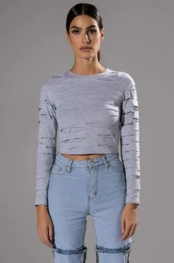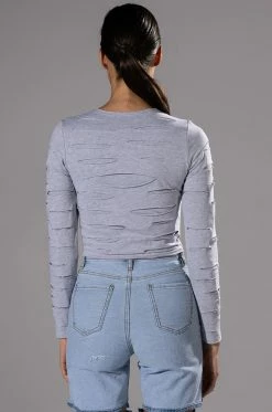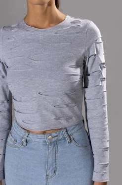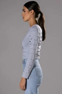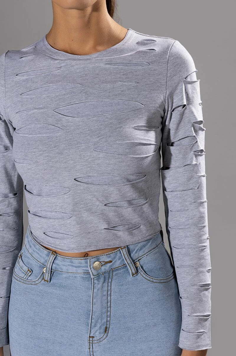 Elevate your wardrobe even higher with the AKIRA Label Come Around Distressed Long Sleeve T Shirt! This cropped top comes in a soft, double-lined fabrication, and is complete with faux slits and cuts, long sleeves, and a crew neckline. Complete this look with blue jeans and a pair of rhinestone embellished pumps!