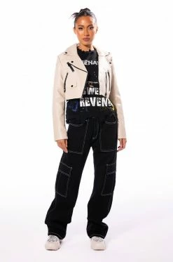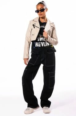 The AKIRA Label Count The Stars Basic Moto Jacket is the answer to your wardrobe wishes. This goes-with-everything staple piece features a structured PU leather fabrication, a classic fold over collar, zippered faux chest pockets, working slant side zipper pockets, long sleeves and a cropped silhouette. Complete with a satin inner lining and contrast black hardware throughout. Style with distressed denim and your favorite stiletto bootie for a chic everyday look.