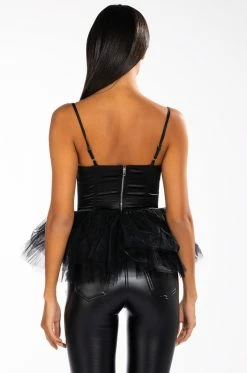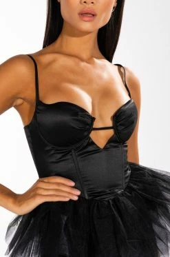 The AKIRA Label Dark Angel Tulle Corset is made from a slick fabrication base and features adjustable spaghetti straps, a sweetheart neckline with padded cups, a sexy chest cutout, boning for structure, a pointed hem with layered tulle, and an exposed back zipper closure.