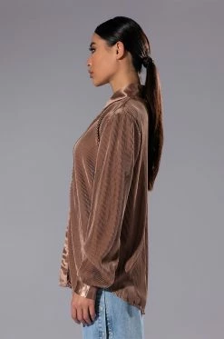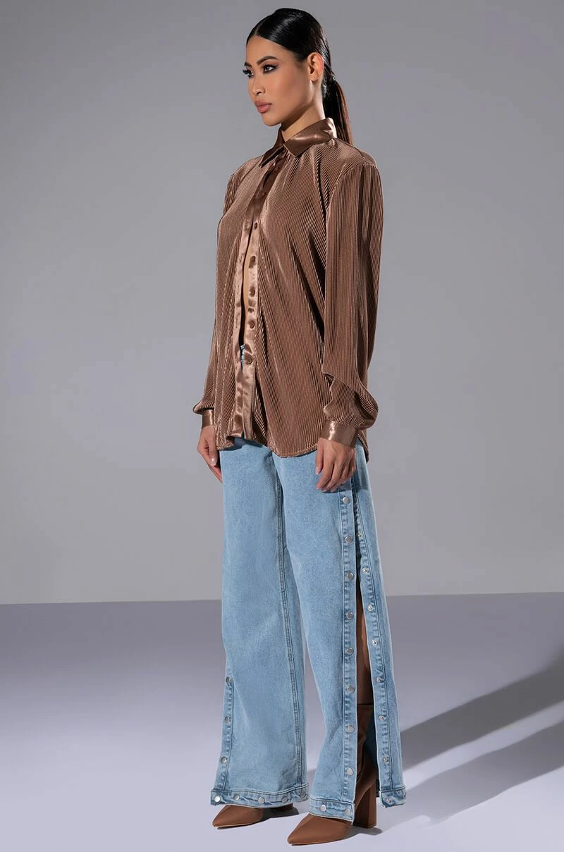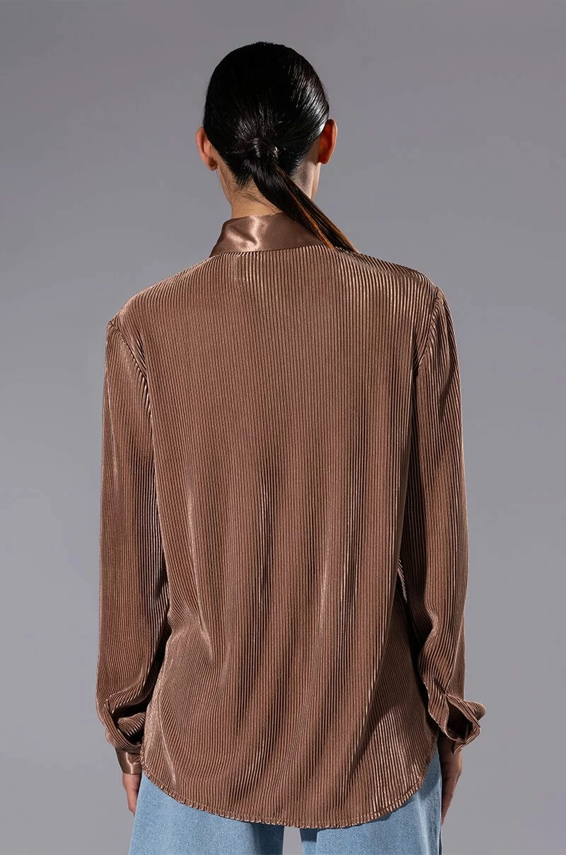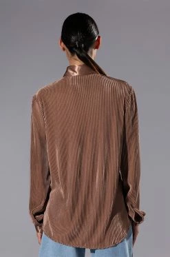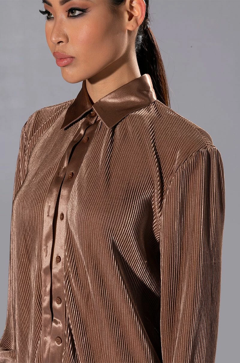 The AKIRA Label Night Out Plisse Button Down Top is a luxe pleated blouse featuring long sleeves with satin buttoned cuffs, a front button up enclosure, and a satin collared neckline. Complete with a longline silhouette and an oversized design. Style this flowy piece with a matching pant, clutch, and heels for an executive day-to-night look.