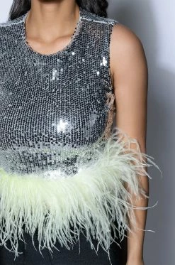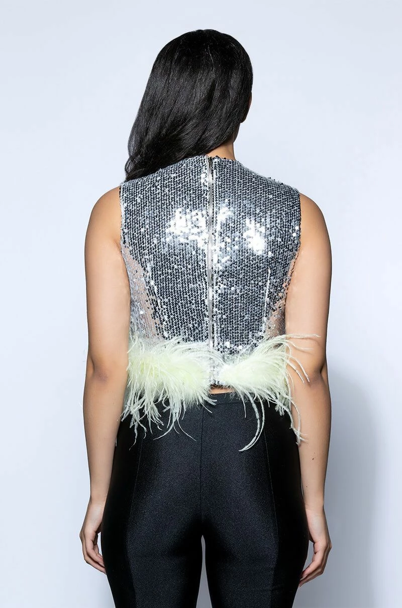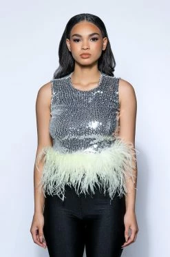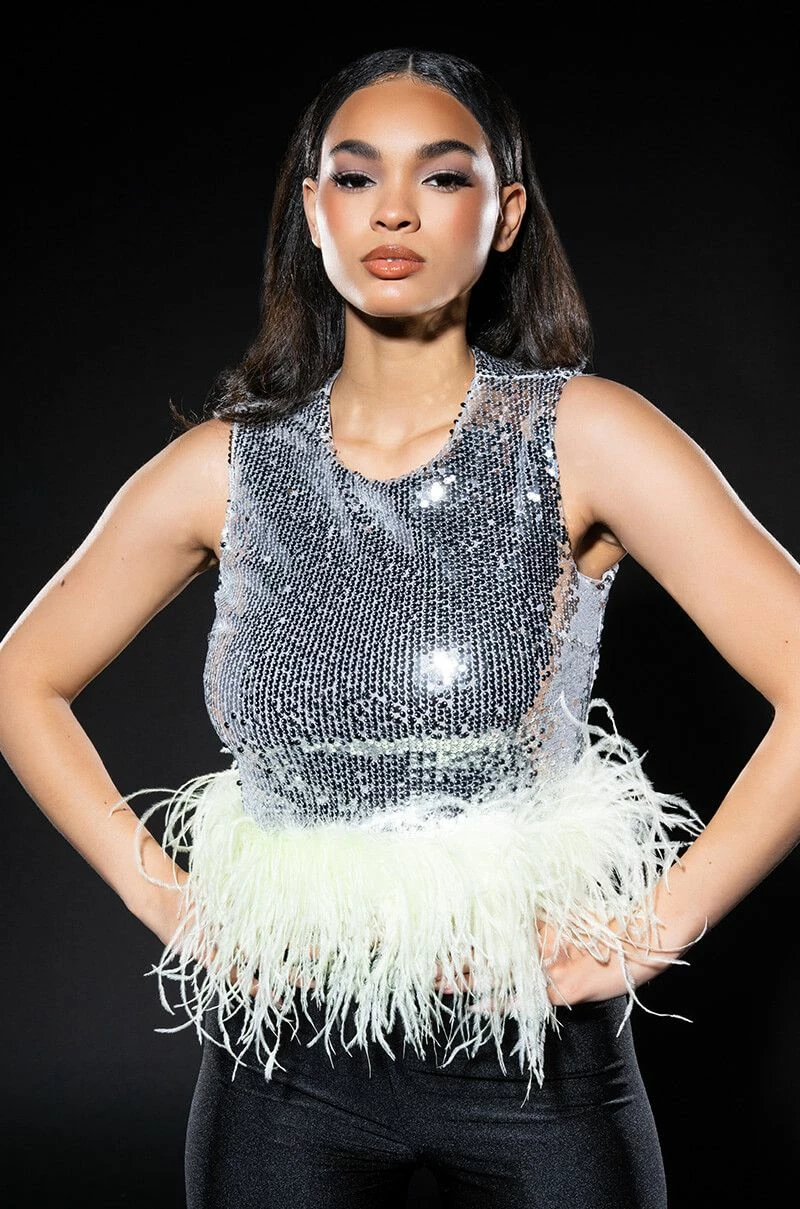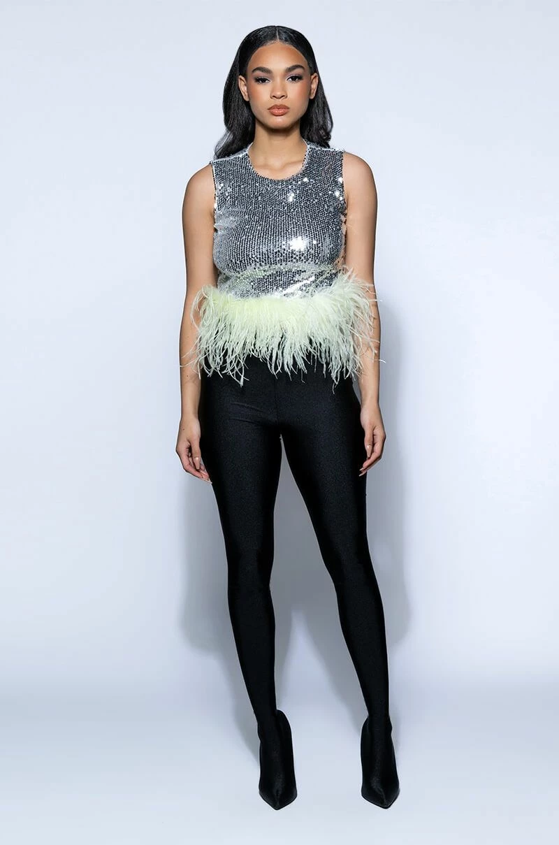 The AKIRA Label Disco Ball Sleeveless Feather Trim Crop Top is made from a sequin-detailed fabrication and features a high, rounded neckline, a sleeveless design, princess seam detailing, slick polyester lining, a cropped silhouette, a feather trim hem, and an exposed back zipper closure. Pair this piece with high rise leggings and platform pumps to complete your dance floor-ready look!