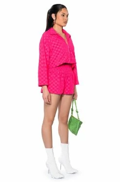 The AKIRA Label Easy Days Zip Up Jacket is part of an uber cute two piece set, made from a checkered terry cloth base fabrication and featuring a pointed fold over collar, long wide sleeves, a boxy, cropped silhouette, and zipper front closure. Style with the matching bottoms, The AKIRA Label Easy Days Pull On Short, and The Snowbell Patent Cold Weather Boot In Pink for a cozy, chic look.