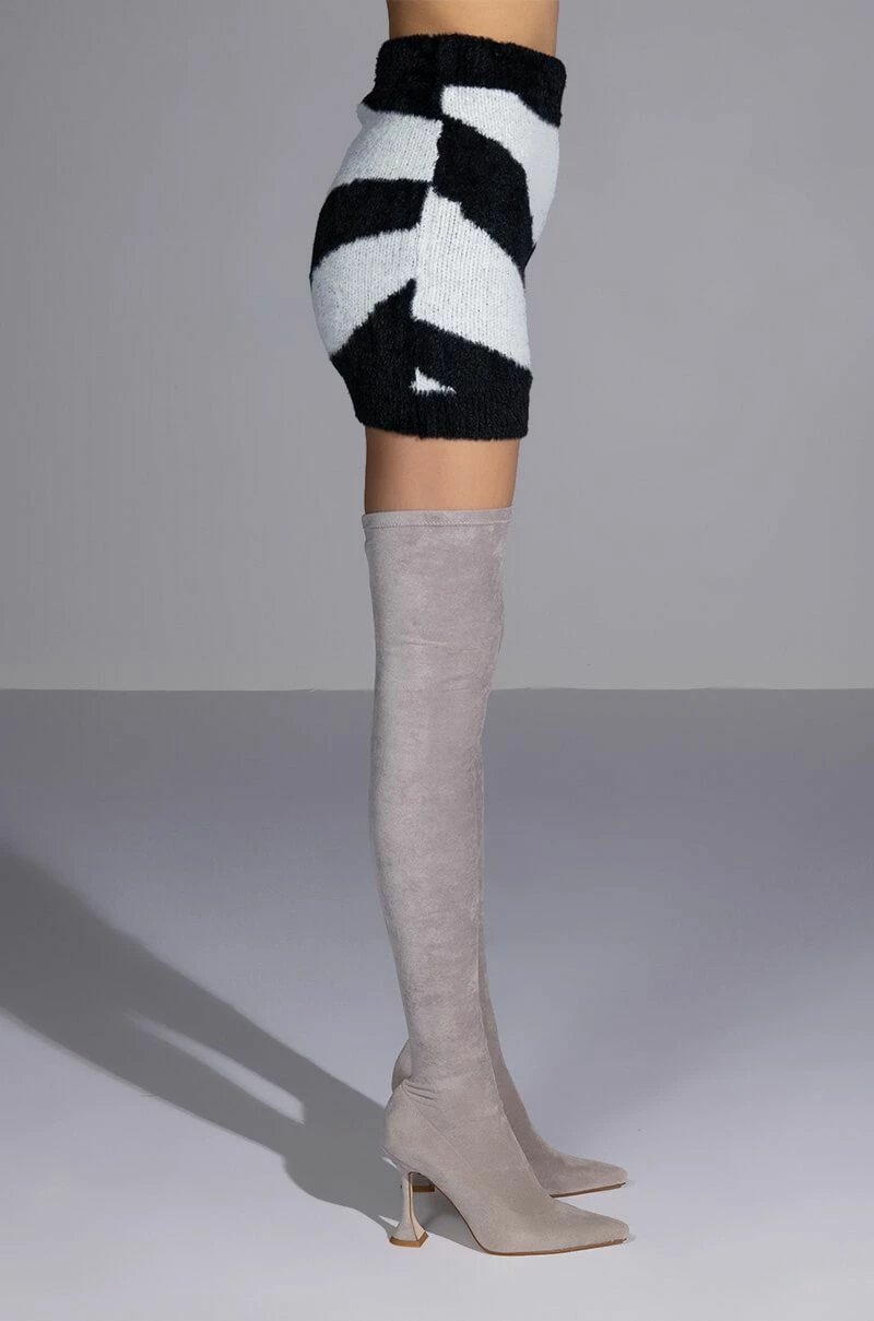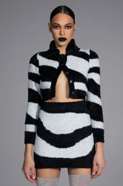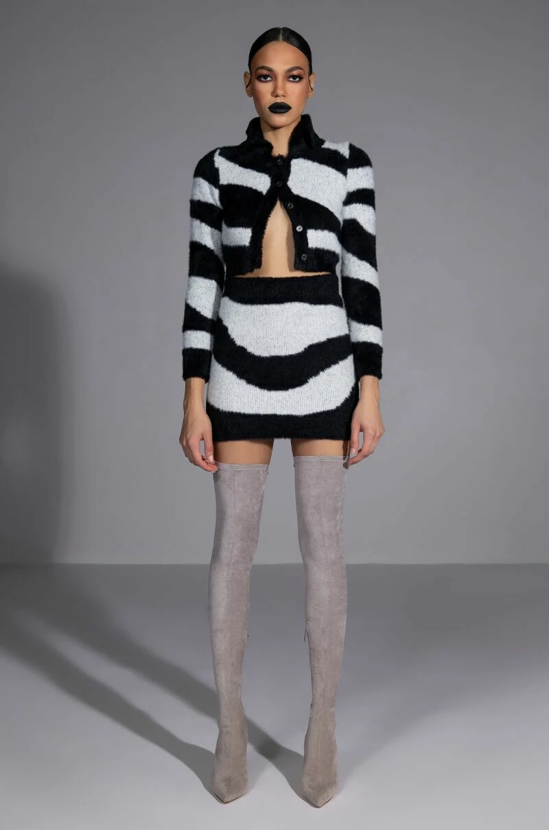 The AKIRA Label Easy Does It Knit Mini Skirt features a stretchy ribbed knit base, a fuzzy textured fabrication, a mini length cut, an allover swirl print, a bodycon silhouette, and a wide elastic waistband. Complete this look with The AKIRA Label Easy Does It Long Sleeve Button Down Sweater.