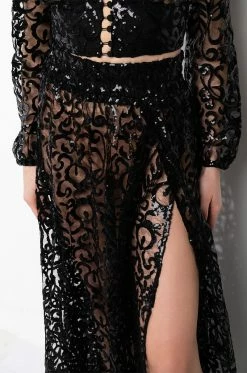 The AKIRA Label Estelle Sequin Maxi Skirt features a structured yet sheer tulle base, maxi silhouette, and an off center high slit. Complete with an elasticized waistband for an hourglass cut and sequin brocade detailing. Pair this piece with the coordinating Estelle Sequin Blouse, a sleek bodysuit, and a PVC pump.