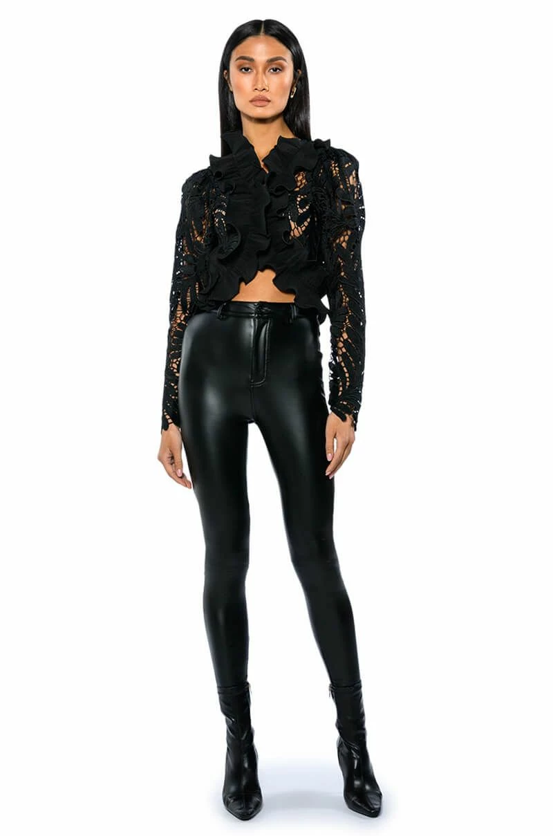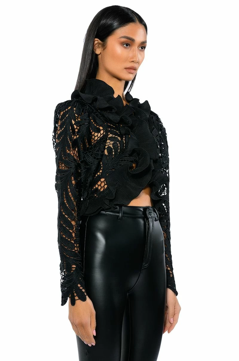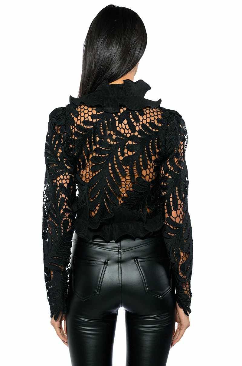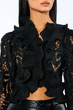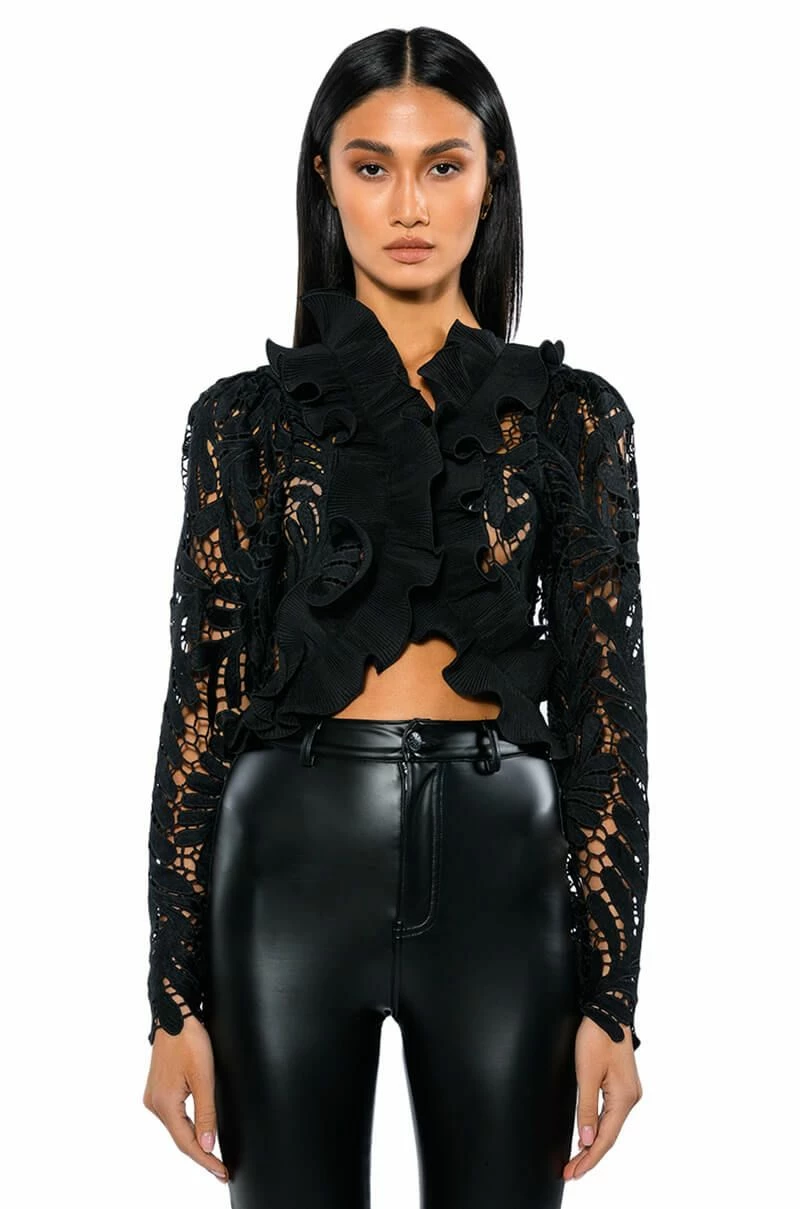 The AKIRA Label Every EventLace Bolero is an unlined sheer lace piece featuring an open front design, a cropped cut, long sleeves, and pleated ruffle trim detailing. Layer this bolero over any of your favorite mini dresses for a complete look.