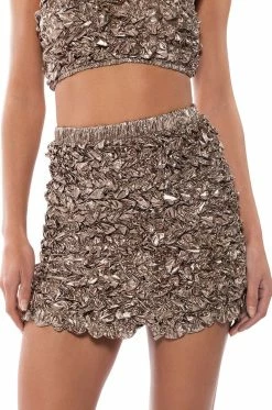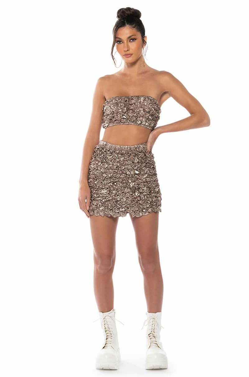 The AKIRA Label Eyes On Me Textured Mini Skirt is part of a two-piece set made from a lightweight, metallic rose gold base fabric and features a stretchy, unlined textured popcorn fabrication, a mini length, an elastic waist, and a pull-on fit. Pair with the coordinating The AKIRA Label Eyes On Me Textured Top for a complete, that-girl look.