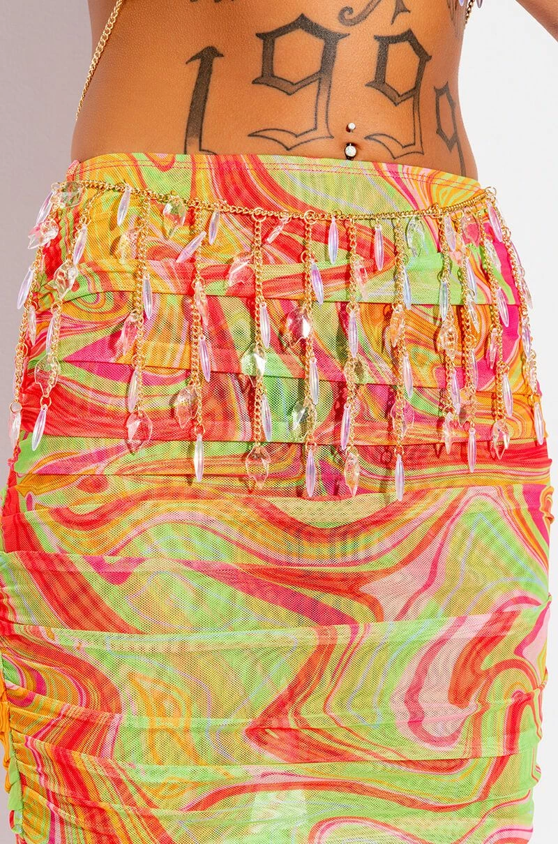 This belt is straight out of a fairy tale. The AKIRA Label Fantasy Drop Razor Crystal Belt features a faux gold chain link base, glimmering AB crystals, glamorous fringe detailing, and a lobster claw clasp closure. Pais perfectly with The AKIRA Label Fantasy Drop Razor Crystal Bra.