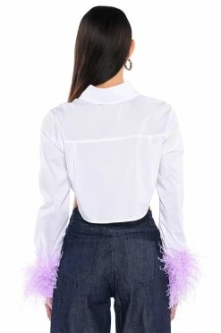 Fly away to fashion paradise with The AKIRA Label Feathers On My Mind Cropped Poplin Shirt With Feathers! This fluttering top is made from a poplin shirt fabrication and features a collared neckline, long sleeves with opulent ostrich feather-detailed wrists, a cropped silhouette, rounded hem, and a button down front closure with a covered placket. Style this top with a pair of fitted trousers and stiletto pumps to complete your chic look.