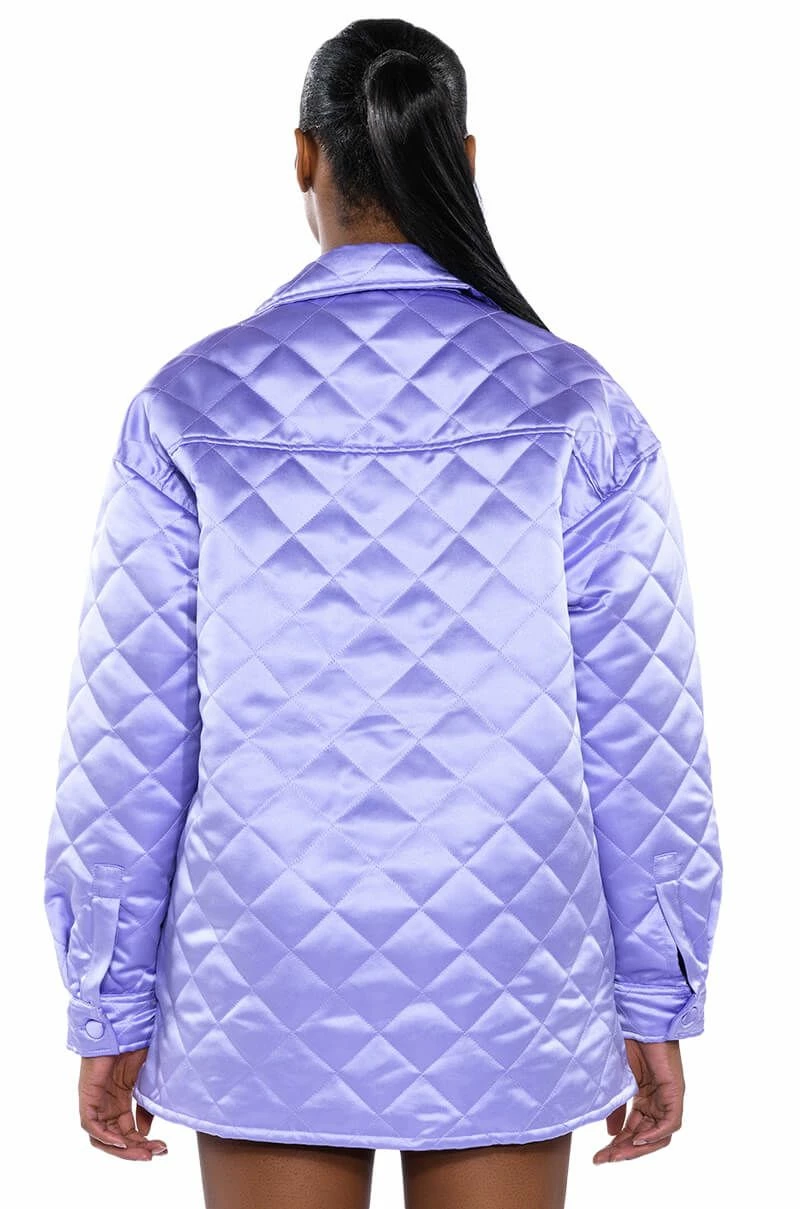 Your wish is our command in The AKIRA Label Field Of Dreams Satin Quilted Shacket. This longline, oversized piece features a quilted satin fabrication, a collared neckline, long button cuff sleeves, a chest pocket, a smooth inner lining, and a button down front closure. Pair this piece with the coordinating AKIRA Label Field Of Dreams Satin Quilted Shorts to complete your look.
