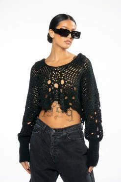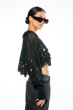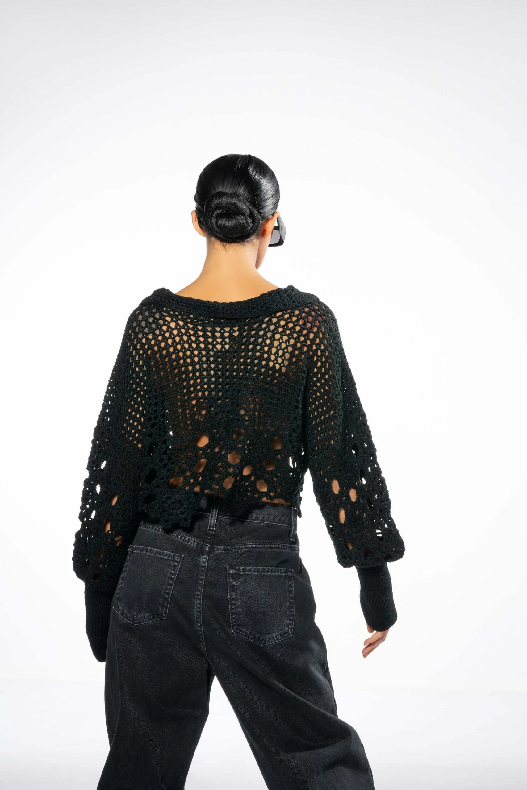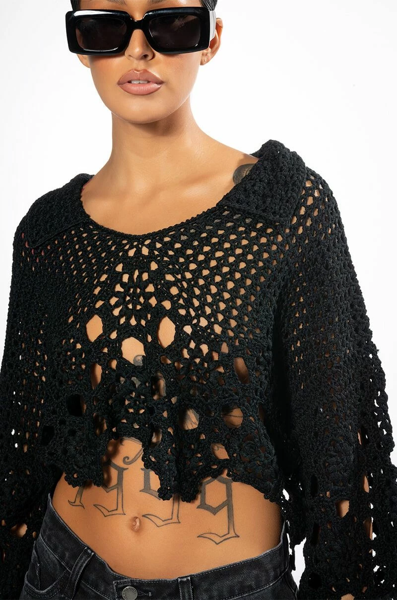 The AKIRA Label Garden Of Eden Collared Crochet Crop Top is made from an unlined crochet base and features floral patterning, a collared neckline, long sleeves with wide ribbed knit cuffs, and a cropped silhouette.
