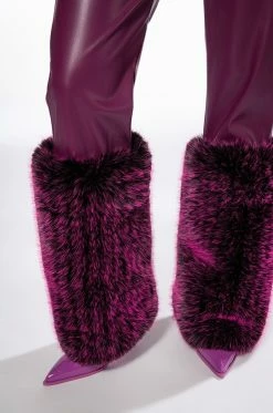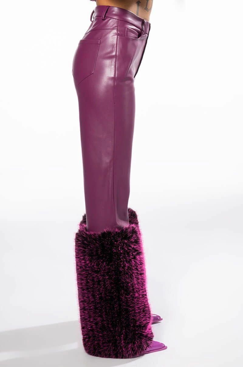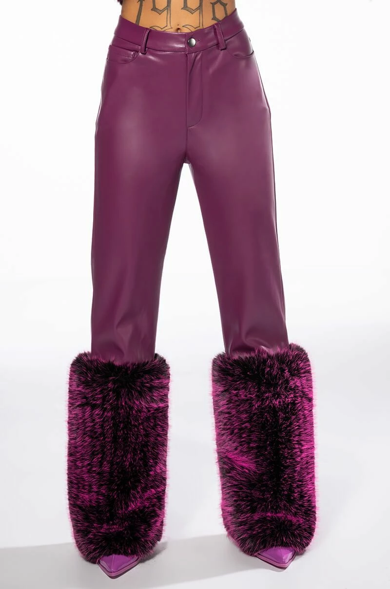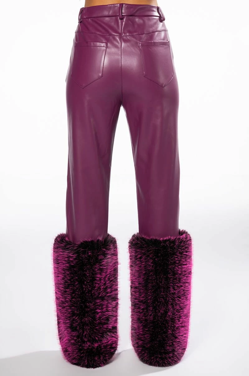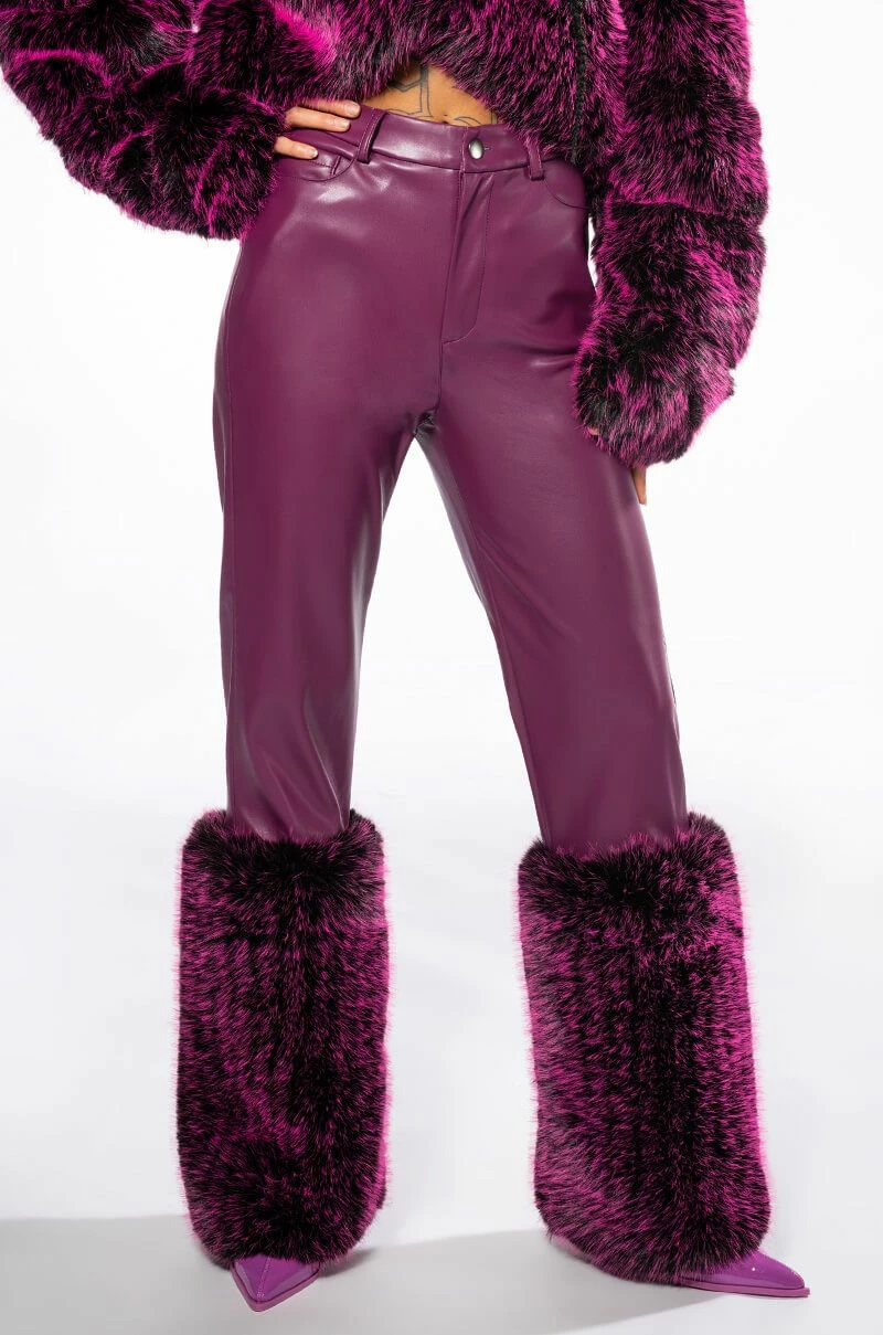 The AKIRA Label Giulia 3D Faux Leather Fur Pants feature a supple vegan leather base, plush faux fur ankle cuffs, a high rise waistline, a five pocket design, and a button front zipper closure. Pair with the coordinating AZALEA WANG Giula 3D Faux Fur Crop Jacket.