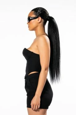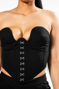 The AKIRA Label Gretel Strapless Corset In Black is made from a slick, lightweight fabrication and features a plunging sweetheart neckline with padded cups, a strapless silhouette, boning for structure, a cropped length, a pointed hem, and mock front hook and eye closures. Complete with a shirred elastic back band with an exposed back zipper closure. Style this piece with the coordinating AKIRA Label Hansel Trench, Hansel Fitted Blazer, and Hansel Fitted Short to complete your tailored look.
