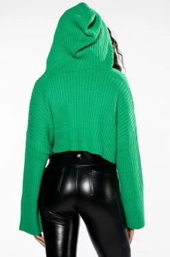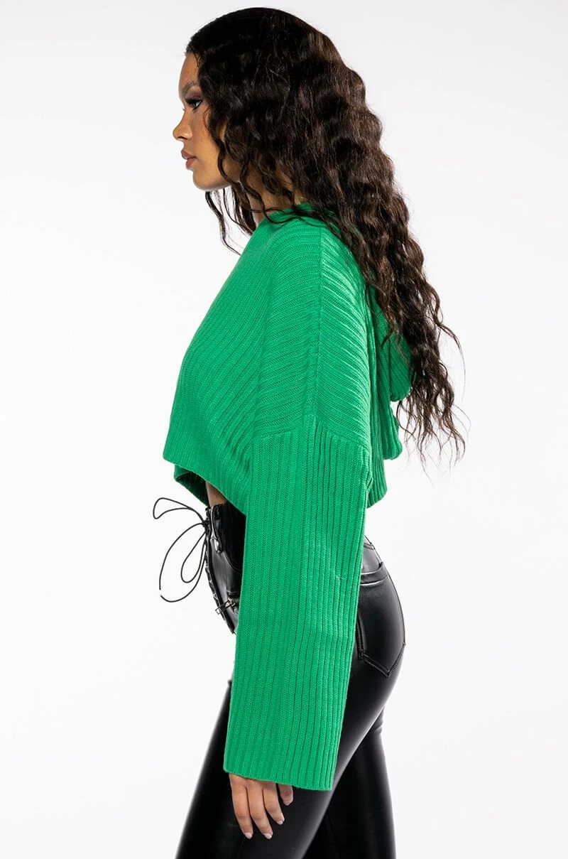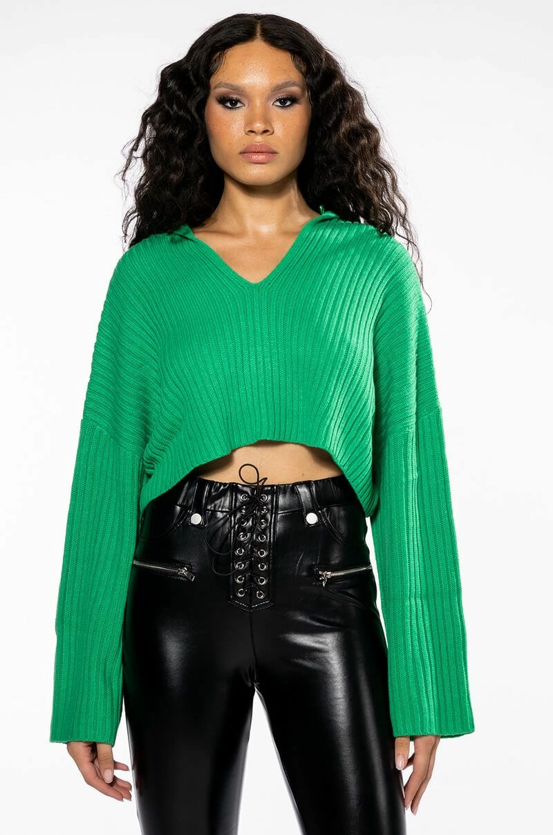 The AKIRA Label Happy Go Lucky Hooded Cropped Sweater is made from a stretchy ribbed knit fabrication and features an attached hood, long sleeves, a boxy fit, and a cropped silhouette.