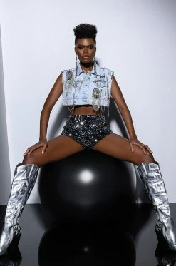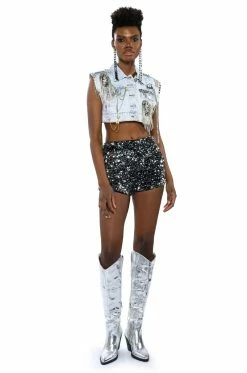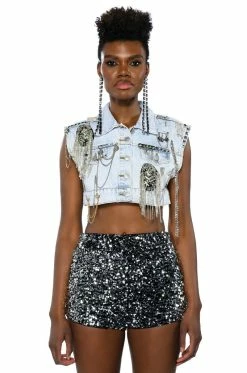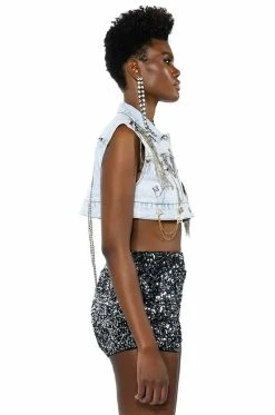 The AKIRA Label Houdini Embellished Denim Vest is a glam rock layering piece featuring a washed denim fabrication, a pointed collar neckline, a sleeveless design, rhinestone chain link-embellished detailing across the front, button front chest pockets, and a cropped silhouette. Complete with a safety pin motif, draped chain link accents, a studded shoulder, and a button down front placket. Pair this piece with the matching AKIRA Label Houdini Embellished Wide Leg Jean.