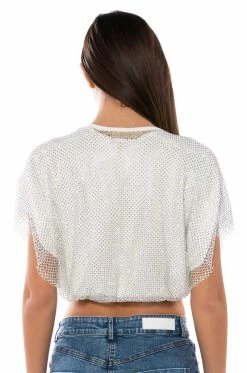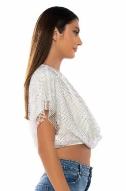 The AKIRA Label Indigo Draped Rhinestone Mesh Blouse In White is made from a soft, stretchy base fabrication and features a plunging cowl neckline, short sleeves, ruched elastic waistband, and a cropped silhouette. Complete with a glimmering, rhinestone embellished layered mesh and a slip-on fit. Style with wide leg satin wide leg bottoms and kitten heels.