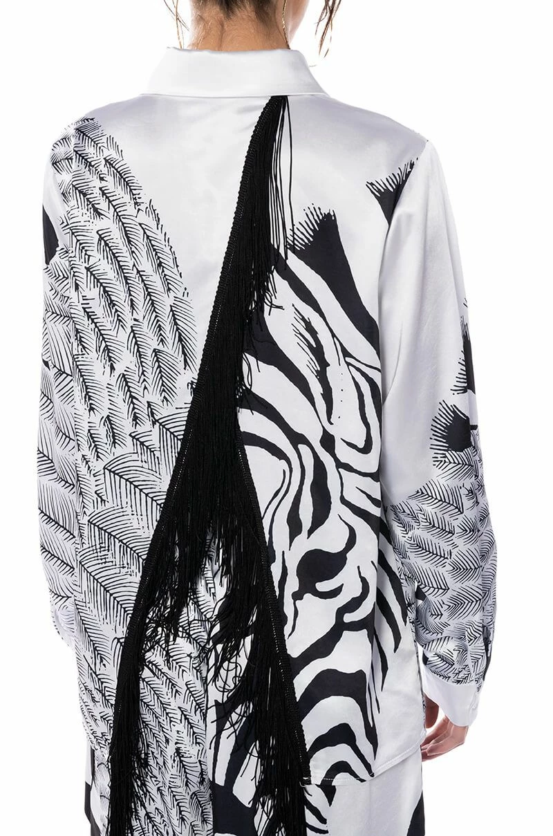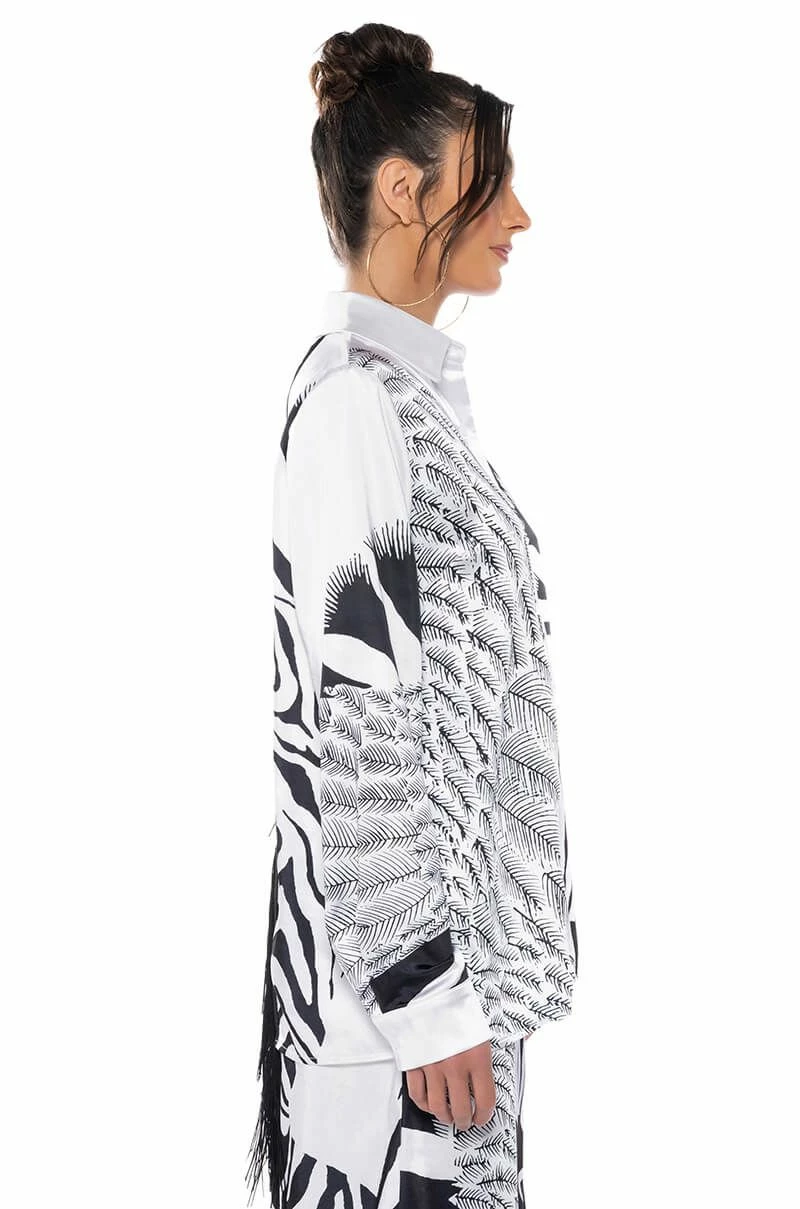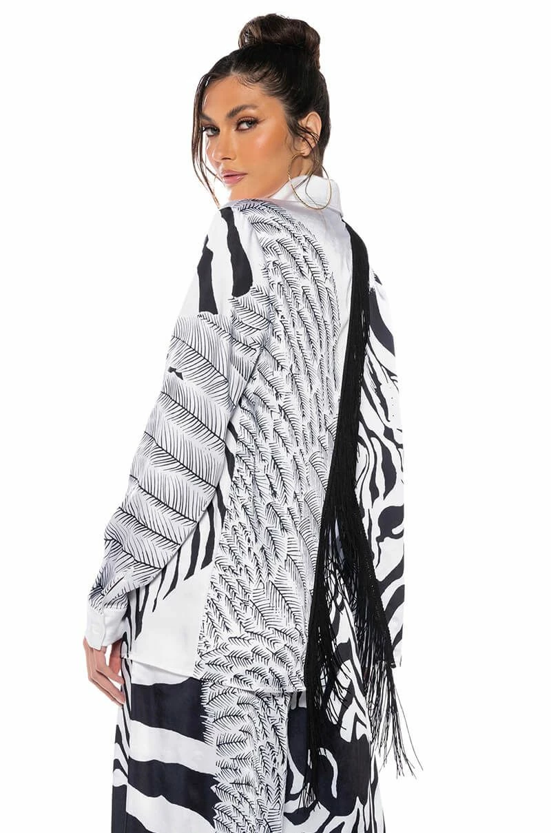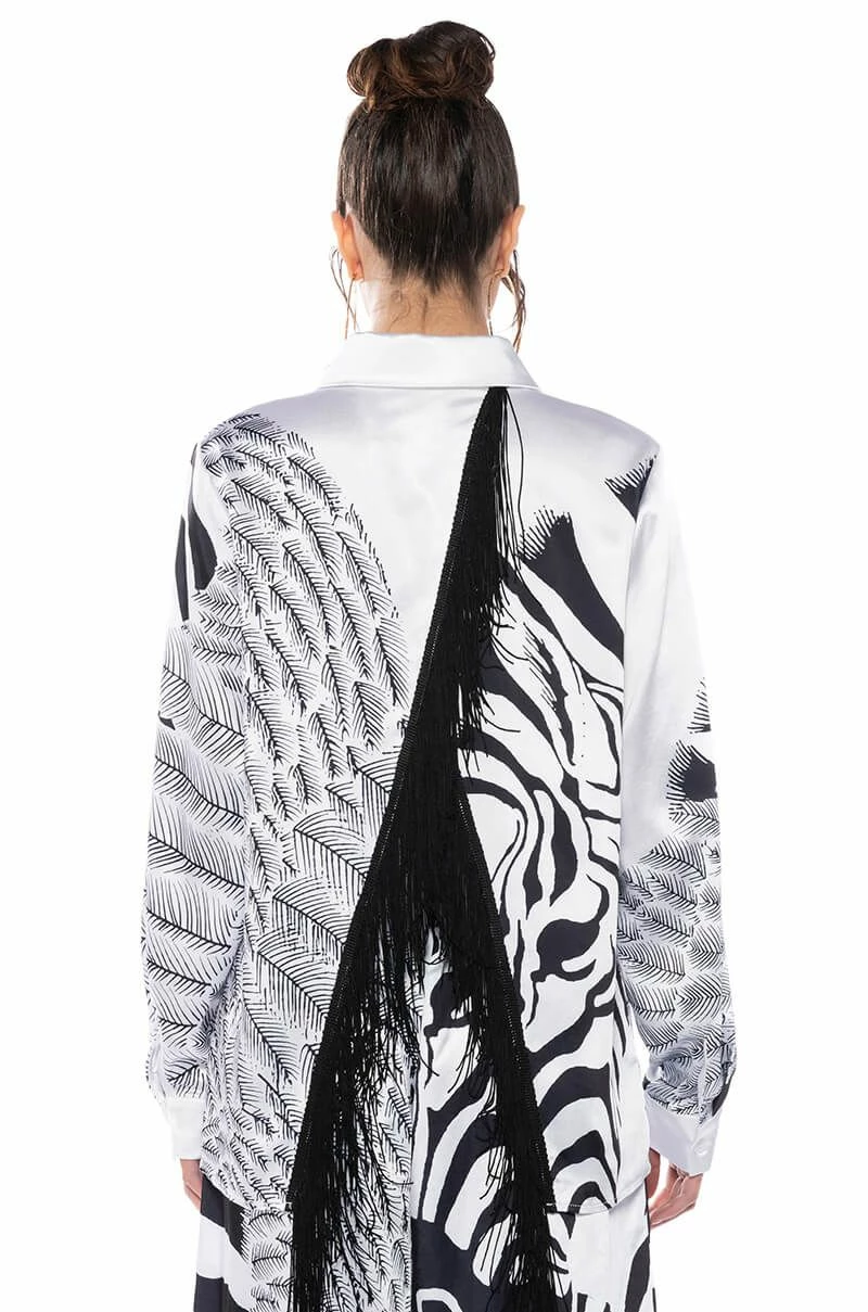 Night time is your time in The AKIRA Label Into The Night Satin Button Down With Fringe. This satin button down features a sexy cut out cross-back silhouette, fringe trim back detailing, long button cuff sleeves, and a button down front placket. Complete with organic print patterning and a collared neckline. Pair with the coordinating AKIRA Label Into The Night Wide Leg Pull On Pant.