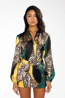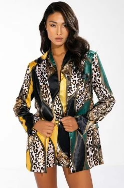 Wild thing, you make our hearts sing. The AKIRA Label Into The Wild Satin Bodysuit is a sexy satin one piece featuring a graphic multi-print satin fabrication, a V neckline, long blouson sleeves, elastic hem wrists, hook and eye front closures, a cheeky mesh bottom, and a snap gusset closure. Pair with the coordinating Into The Wild Printed Satin Shorts and Into The Wild Printed Satin Blazer for a complete look