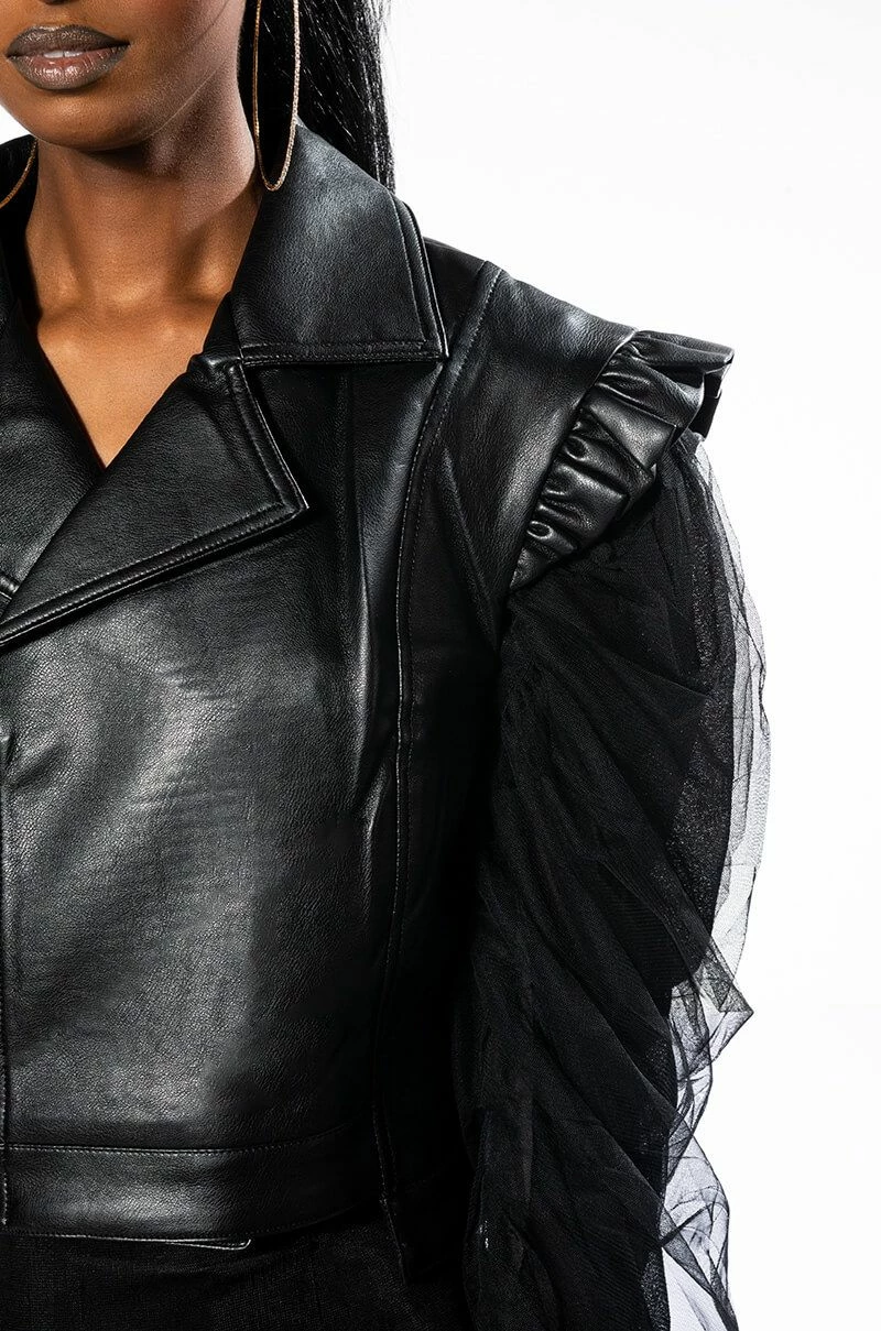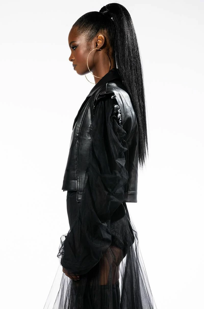 We know you slay all day, every day. The AKIRA Label Itβs My Time Moto Jacket With Mesh Puff Sleeve features a structured PU leather fabrication, a classic fold over lapel collar, ruffled shoulder detailing, sheer mesh long blouson sleeves, and button cuff wrists.Complet with a zip front design. Style with distressed denim and your favorite stiletto bootie for a complete look.
