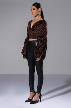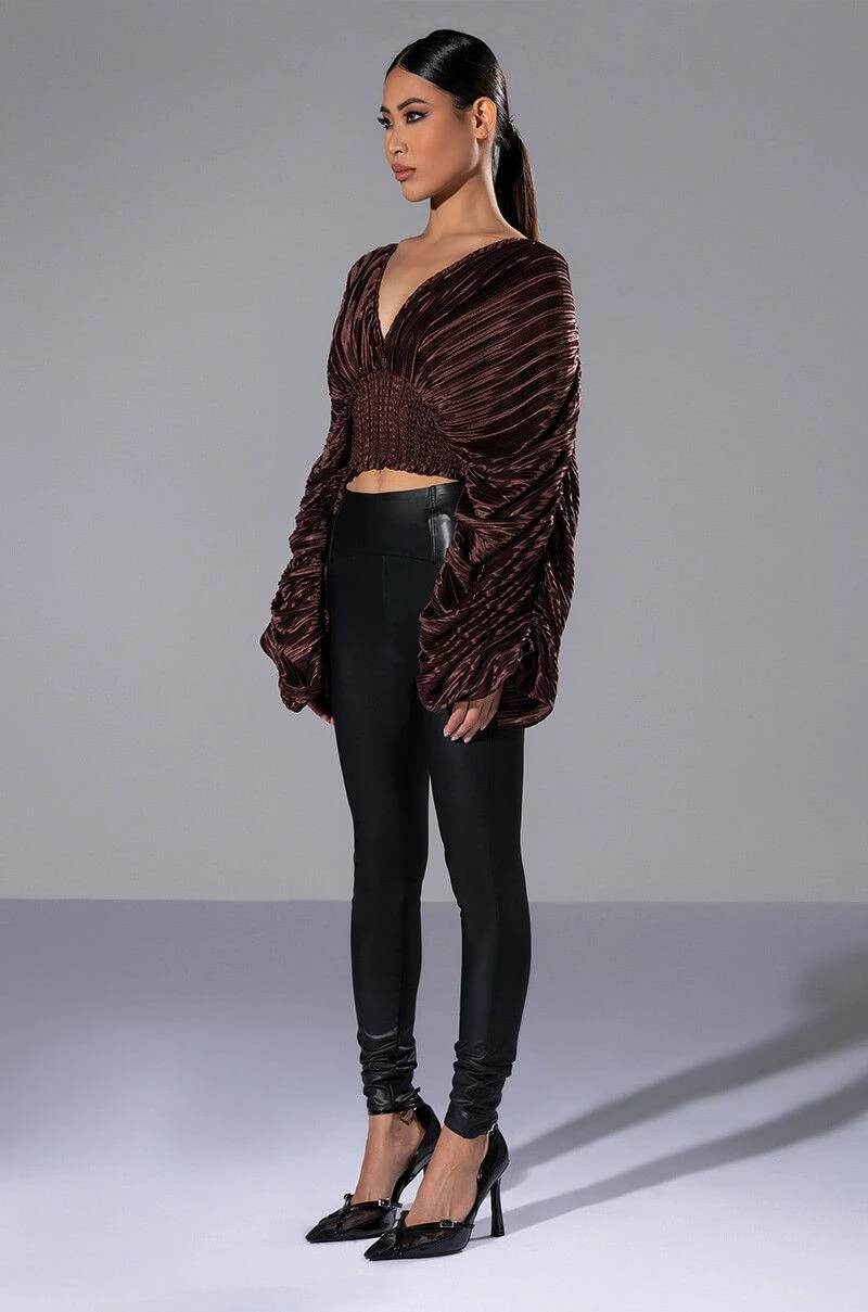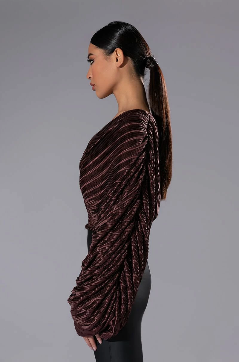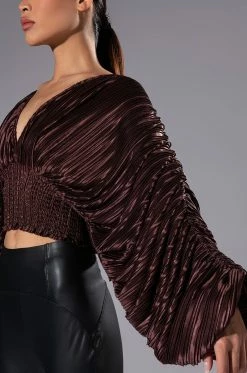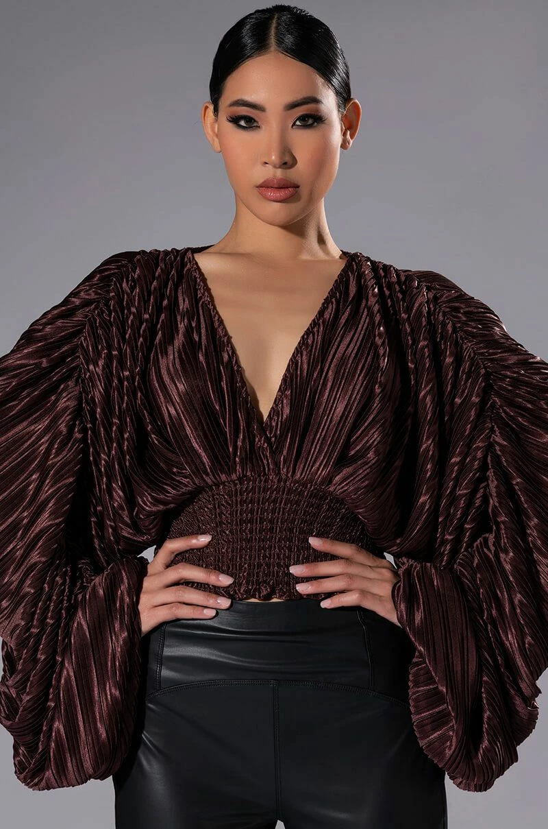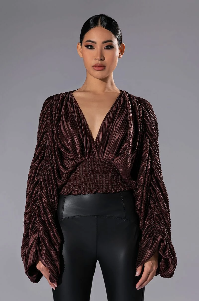 Feel the island breeze in The AKIRA Label Kahanu Flowy Satin Blouse! This top is made from a sleek satin fabrication and features a plunging neckline, long ruched sleeves, and a shirred elastic waist.