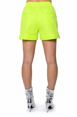 The AKIRA Label Kai Pull On Shorts are part of a flowy chic two-piece set, made from a lightweight, neon base fabrication. It features a wide, shirred elastic drawstring waistband, buttoned flap front pockets with silver metallic detail, and a mini length silhouette. Complete with working back pockets and a pull-on fit. Style with the coordinating top, The AKIRA Label Kai Button Down Shirt, and chunky boots for a bold, everyday look.