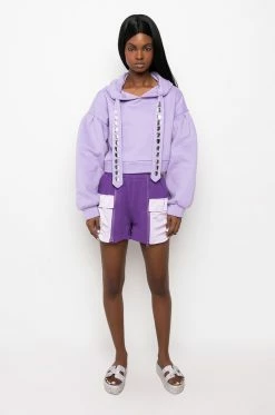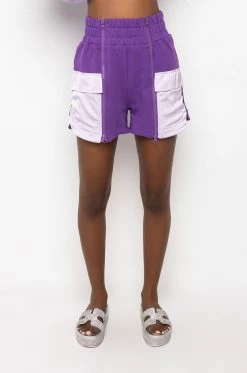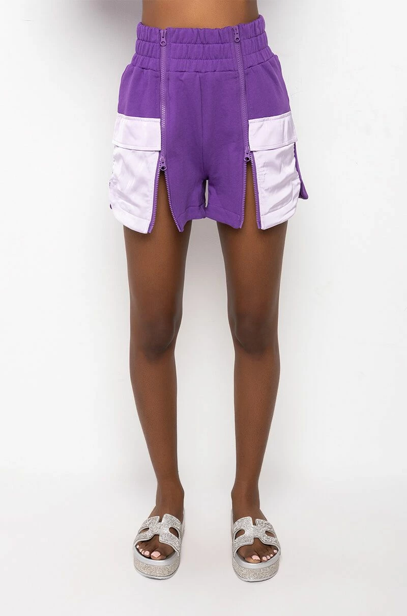 The AKIRA Label Kaia Satin Detail Short is made from a classic sweat fabrication and is complete with front satin flap pockets, a high rise waistline, and two front zipper detailed closures.