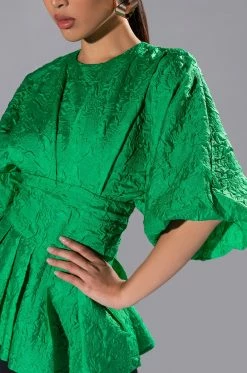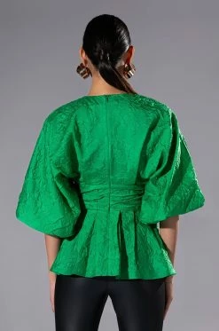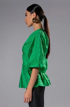 The AKIRA Label Ladies Who Lunch High Neck Statement Sleeve Blouse is a textured top featuring a high neckline, three quarter length puff sleeves, a cinched waist, and a peplum hem. Complete with a mesh inner lining and a concealed back zipper closure.