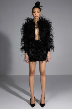 Live lavish in The AKIRA Label Living It Up Satin And Spikes Feather Mini Skirt. This luxe satin piece features a mini length silhouette, tonal spike accents, real feather trim detailing, and an exposed back zipper closure. Pair this piece with the matching AKIRA Label Living It Up Spikes And Feathers Cropped Bomber and flatform boots to complete your look!