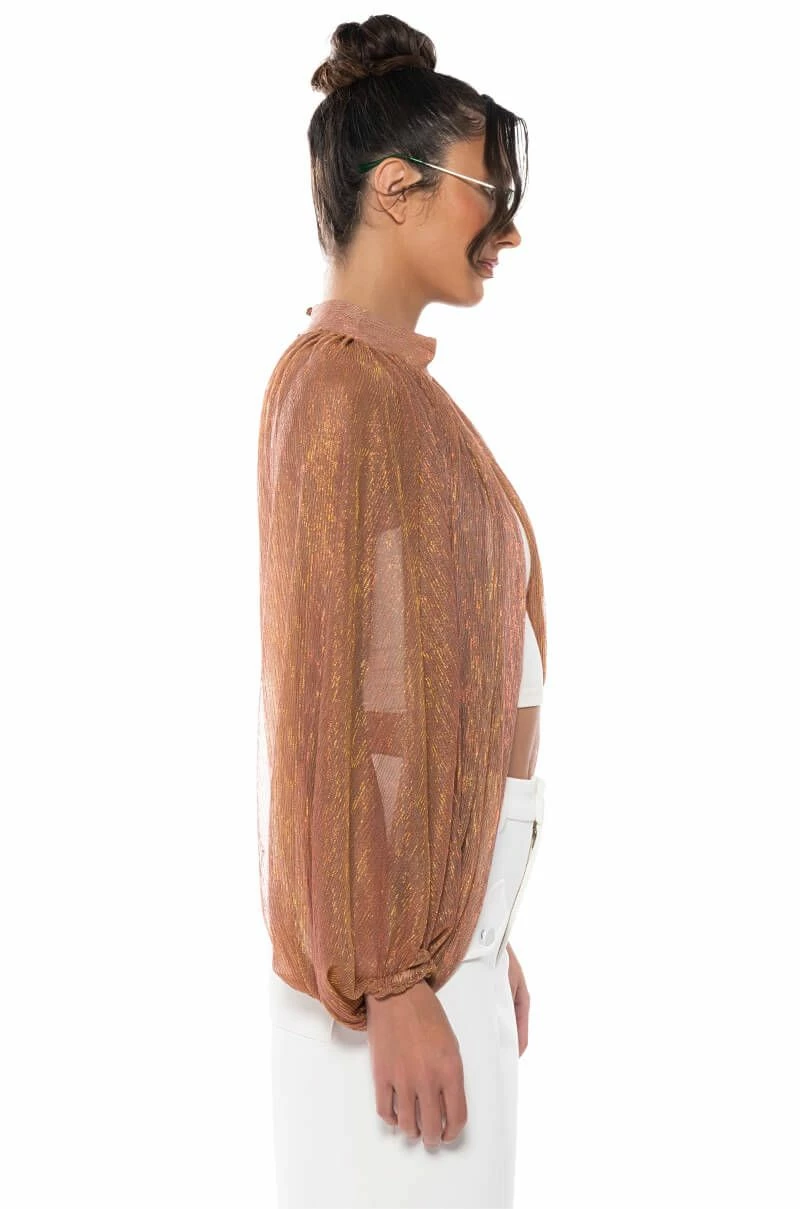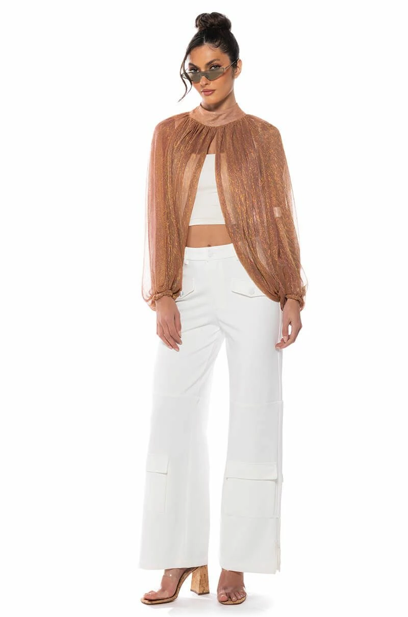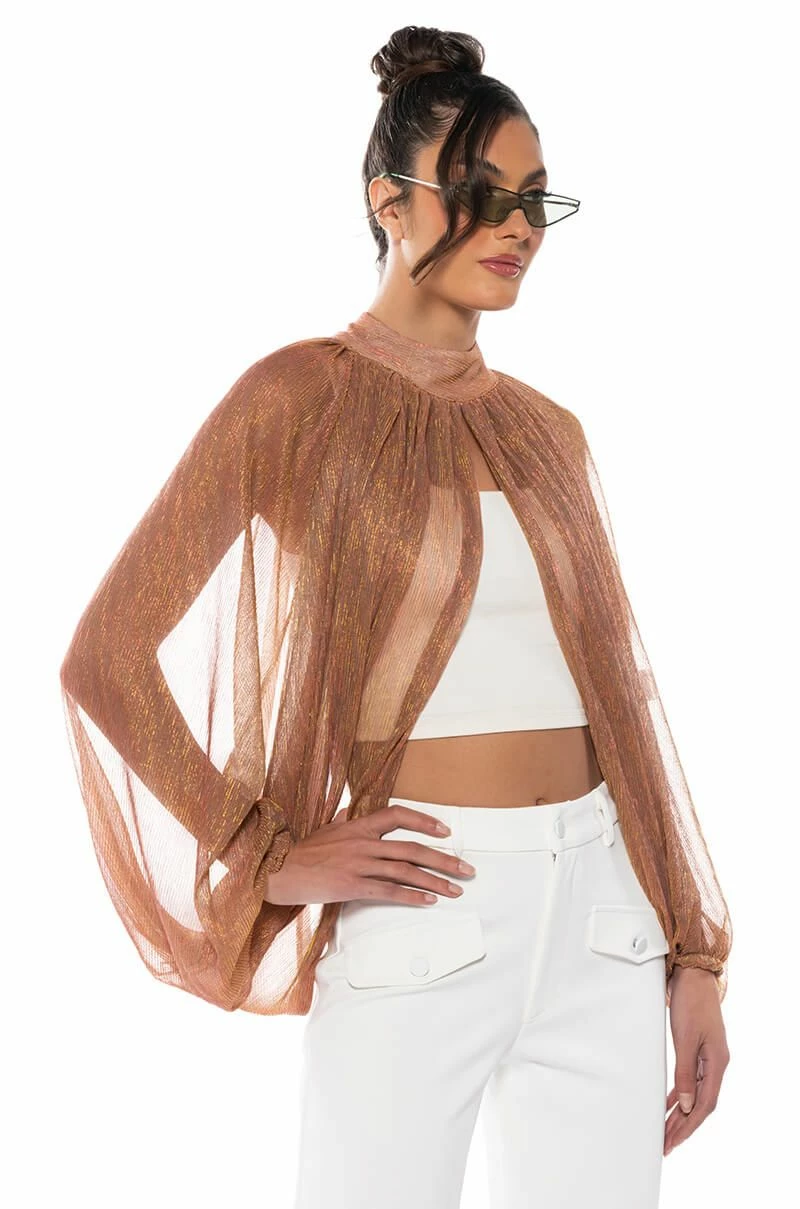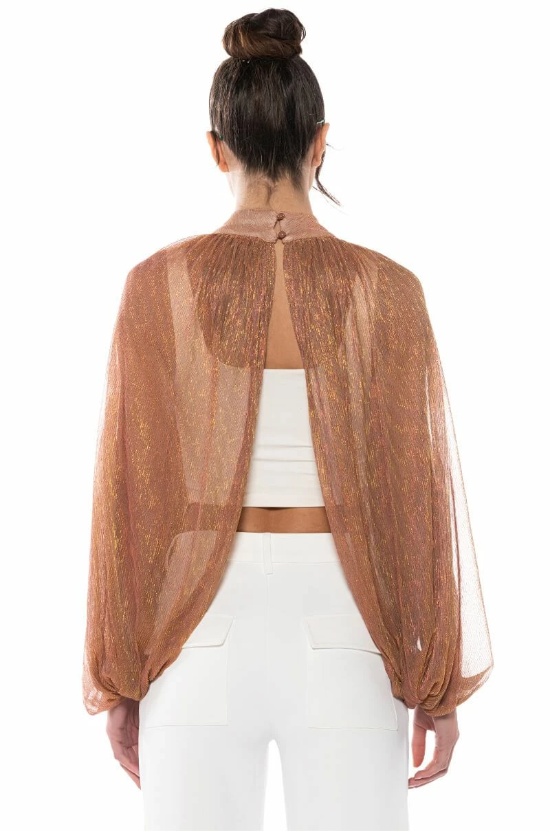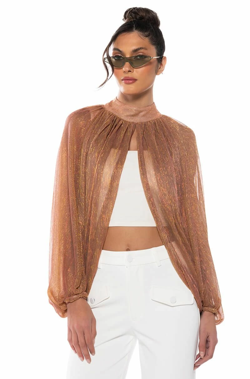 Slay all day in The AKIRA Label Monica Sheer Overlay Blouse in Rust. This sheer base piece features a mock turtleneck, an open front design, ultra-cropped cut, and long blouson sleeves. Complete with iridescent, metallic threading detail and a back neck buttoned closure. Layer this top over any of your favorite mini dresses or tops to add an extra dash of chic to your look.