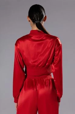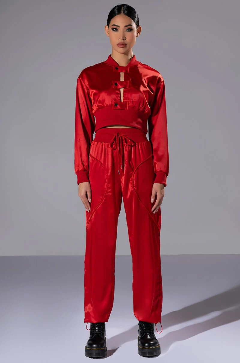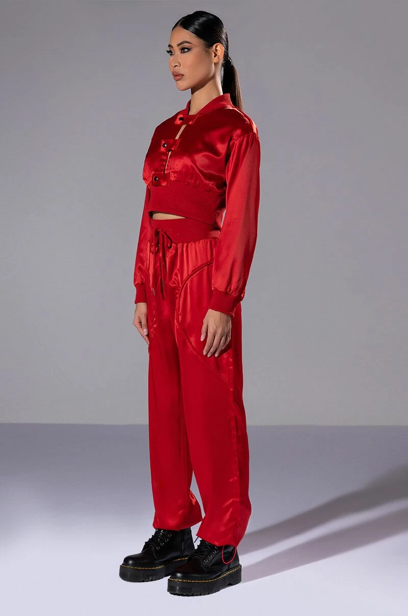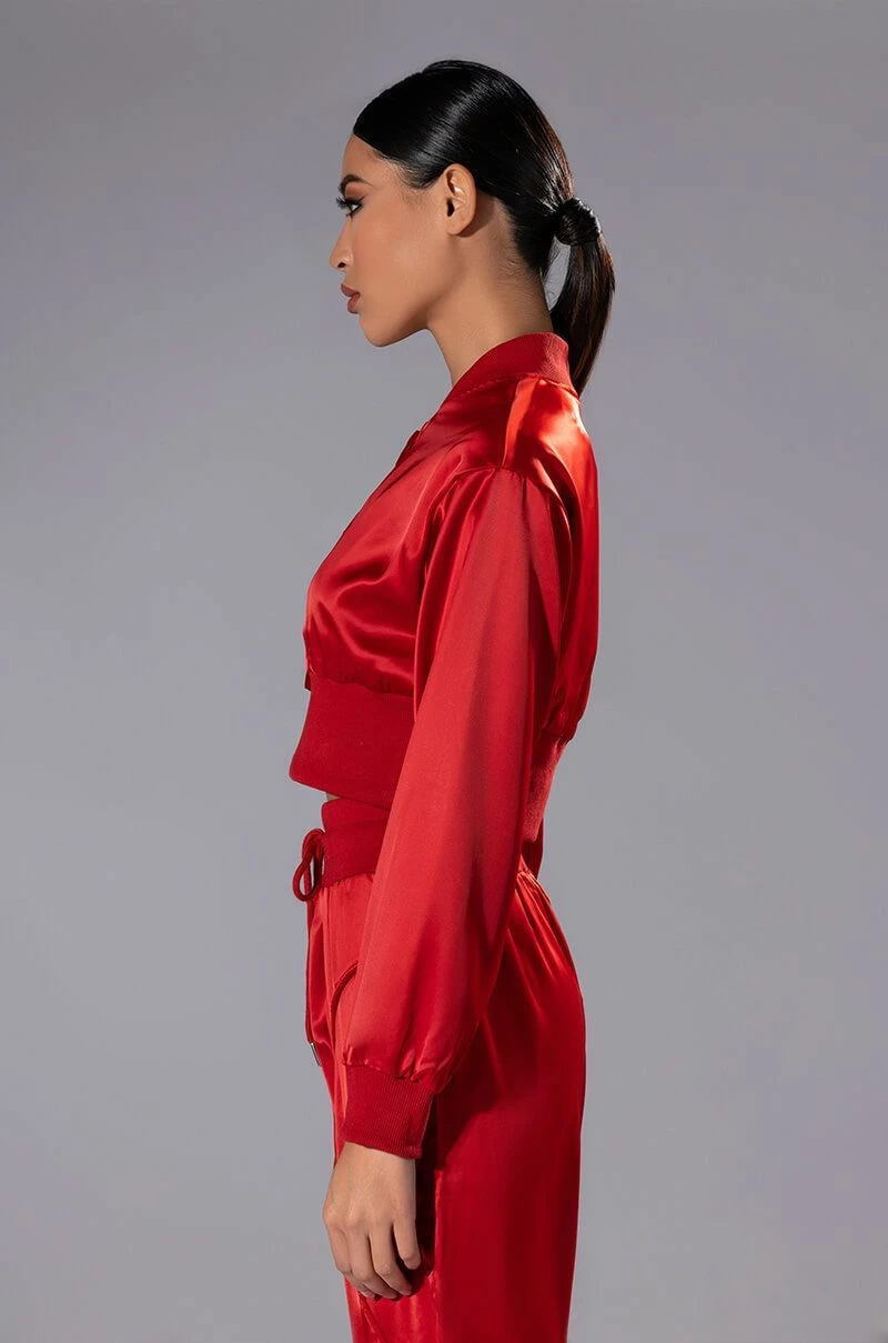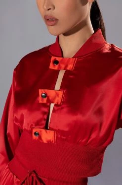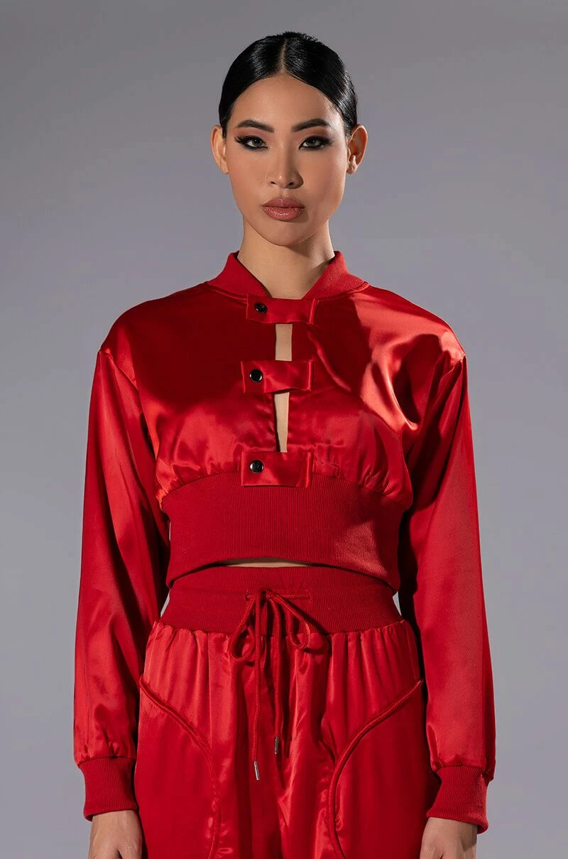 Keep them all guessing in The AKIRA Label Never Boring Satin Snap Front Pullover! This slick satin fabrication piece features a bomber-like design with a low-cut standing collar, long sleeves, a cropped silhouette, sexy chest cutouts, ribbed elastic hems, and snap button satin strap front closures. Pair this piece with the matching AKIRA Label Never Boring Satin Drawstring Jogger to complete your look.