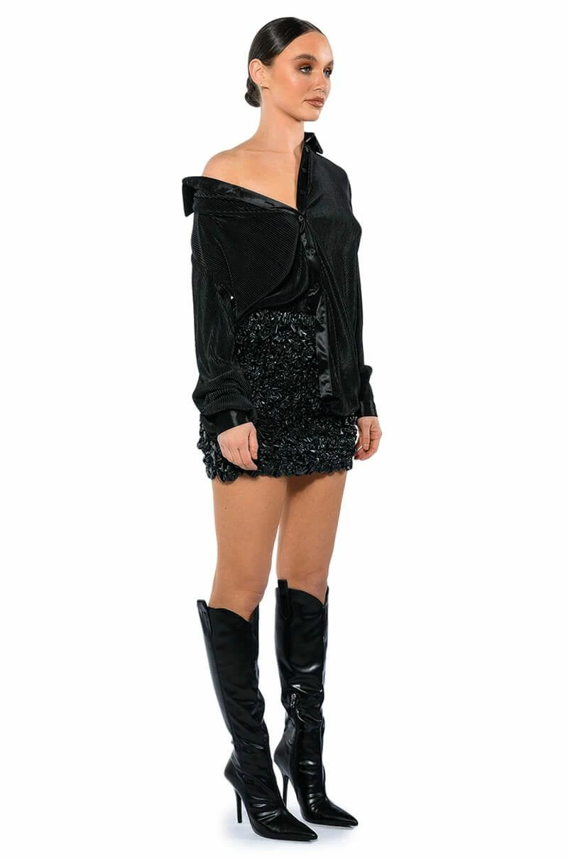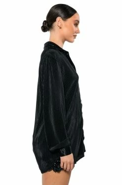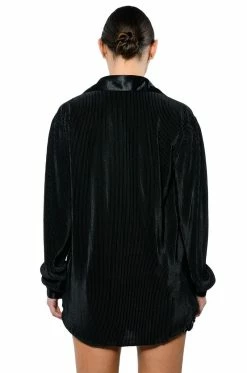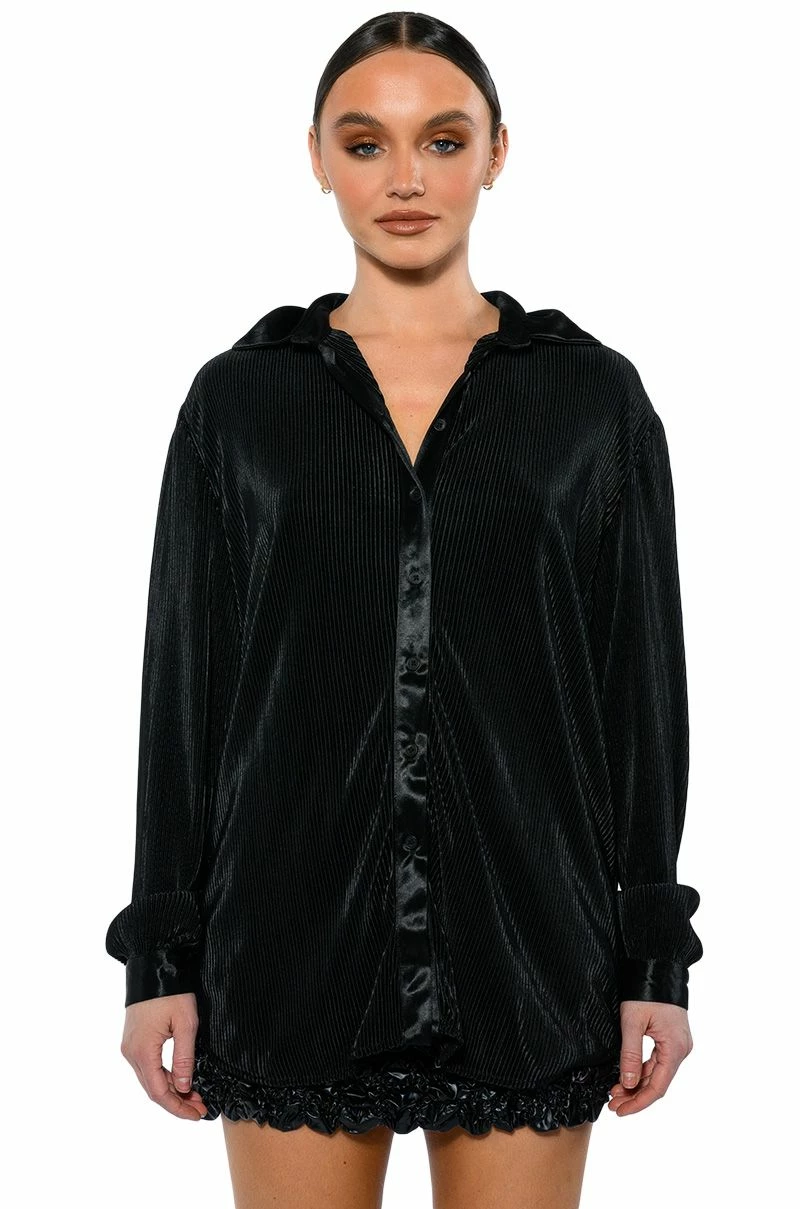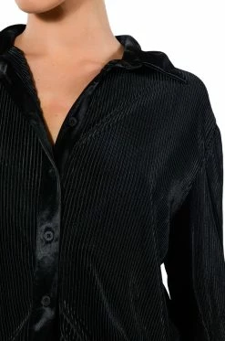 The AKIRA Label Night Out Plisse Button Down Top is a luxe pleated blouse featuring long sleeves with satin buttoned cuffs, a front button up enclosure, and a satin collared neckline. Complete with a longline silhouette and an oversized design. Style this flowy piece with a matching pant, clutch, and heels for an elegant dinner date look.