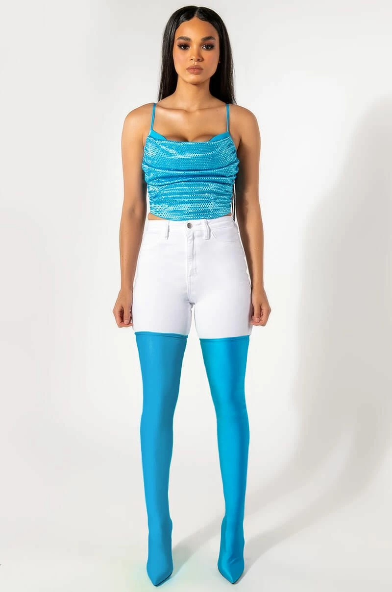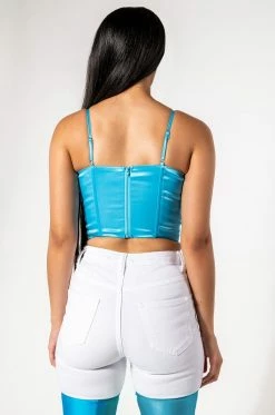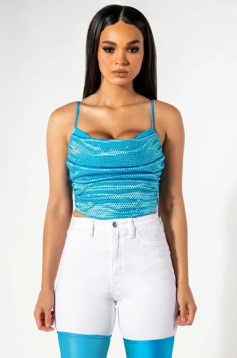 The AKIRA Label Nova Girl Rhinestone Cowl Neck Tank is made from a satin fabrication and features adjustable spaghetti straps, a cowl neckline, attached padded cups, rhinestone body detailing, boning for structure, and a tonal back zipper closure.