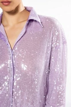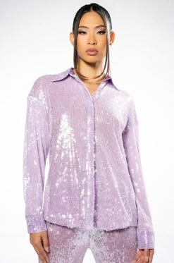The AKIRA Label Oh You Fancy Sequin Button Down Blouse features a mesh base, shimmer sequin detailing, a fold over collar, long sleeves, tonal button cuff detailing, a rounded hem, and a front button down closure, and a covered button front placket. Pair with the coordinating AKIRA Label Oh You Fancy Sequin Wide Leg Pant for a complete look.