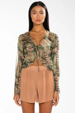 The AKIRA Label One With Nature Long Sleeve Tie Front Chiffon Blouse is made from a sheer chiffon fabrication and features a tropical leaf print, long, a plunging neckline with tie detail, long, flowy sleeves, a cropped silhouette, and a tulip-style front hem. Pair this tropic piece with wide leg bottoms and strappy sandals to finish off your vacay-ready look!