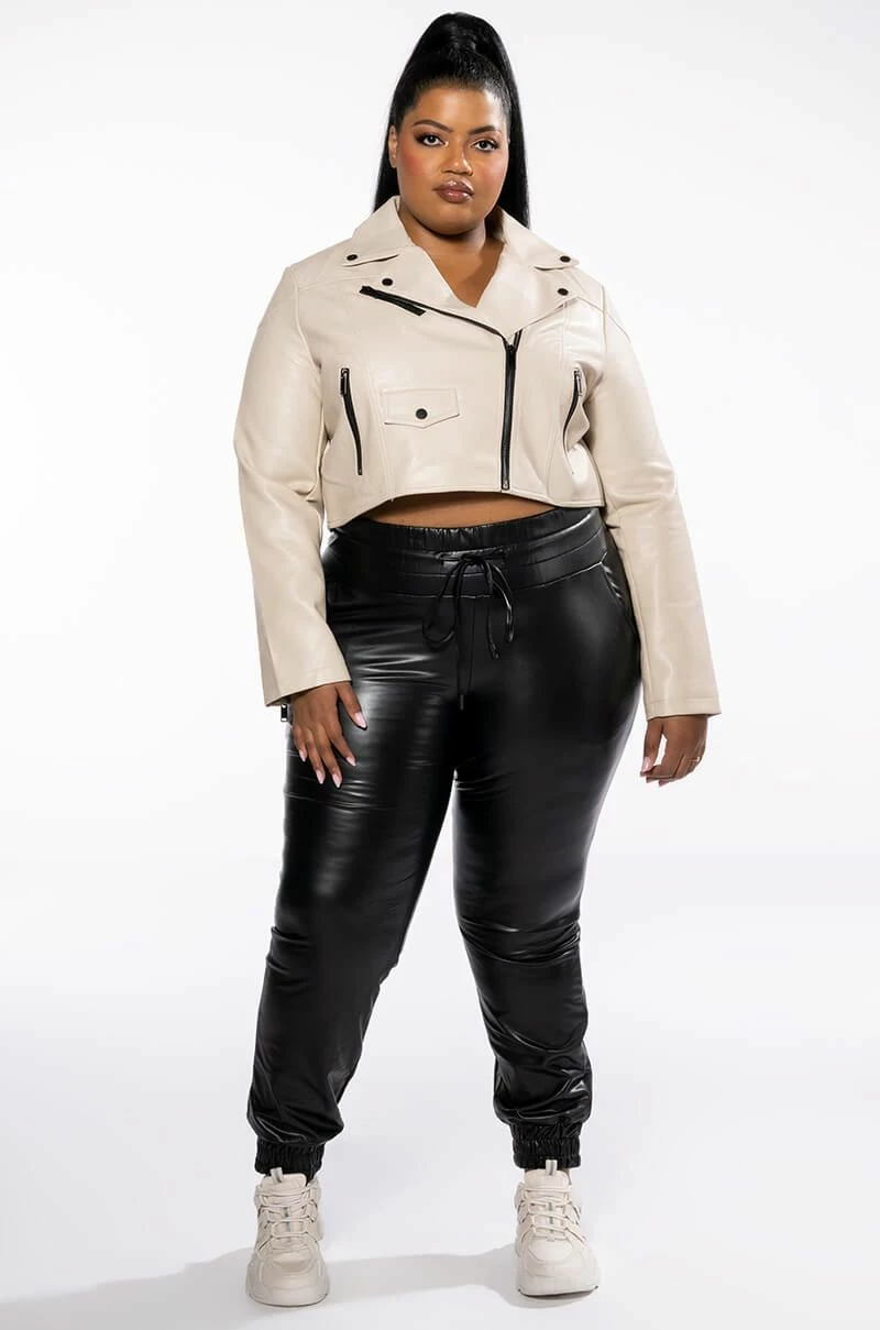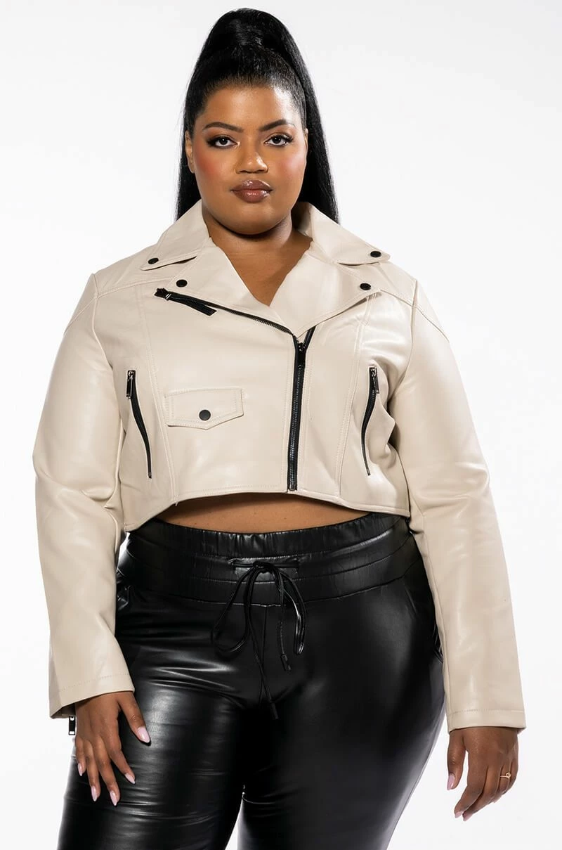The AKIRA Label Plus Count The Stars Basic Moto Jacket is the answer to your wardrobe wishes. This goes-with-everything staple piece features a structured PU leather fabrication, a classic fold over collar, zippered faux chest pockets, working slant side zipper pockets, long sleeves and a cropped silhouette. Complete with a satin inner lining and contrast black hardware throughout. Style with distressed denim and your favorite stiletto bootie for a chic everyday look.