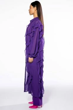 The AKIRA Label Purple Rain Ruffled Longline Blouse is made from a sheer, lightweight fabrication and features a collared neckline, long blouson sleeves with button cuff wrists, ruffled column detailing along the front and back, a longline silhouette, and a button down front closure. Pair this piece with the coordinating AKIRA Label Purple Rain Trouser to complete your look.