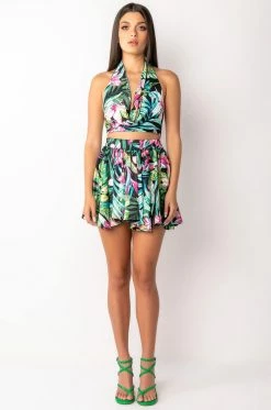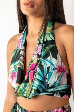 Celebrate yourself with The AKIRA Label Quality Time Floral Halter Top. This satin halter crop top features a floral orchid print pattern, a tie back halter neckline, an open back, and a scrunched elastic back band. Par this piece with the coordinating AKIRA Label Quality Time Floral Mini Shorts for a complete look.