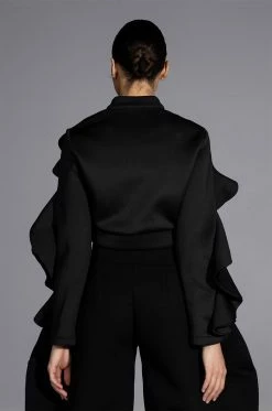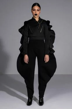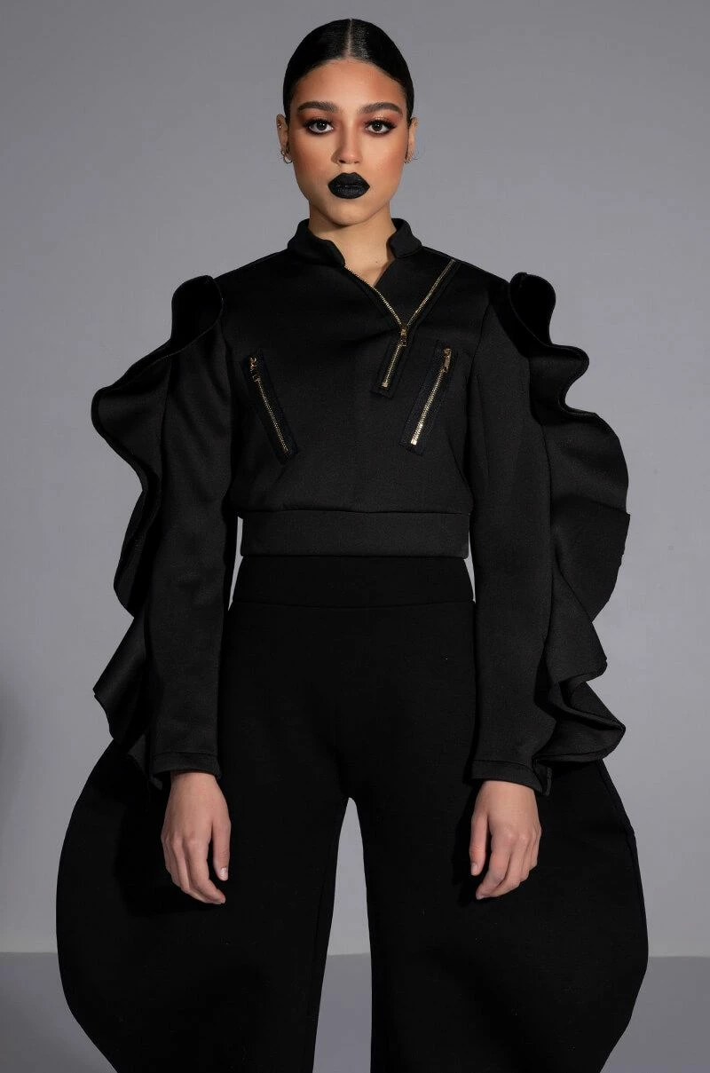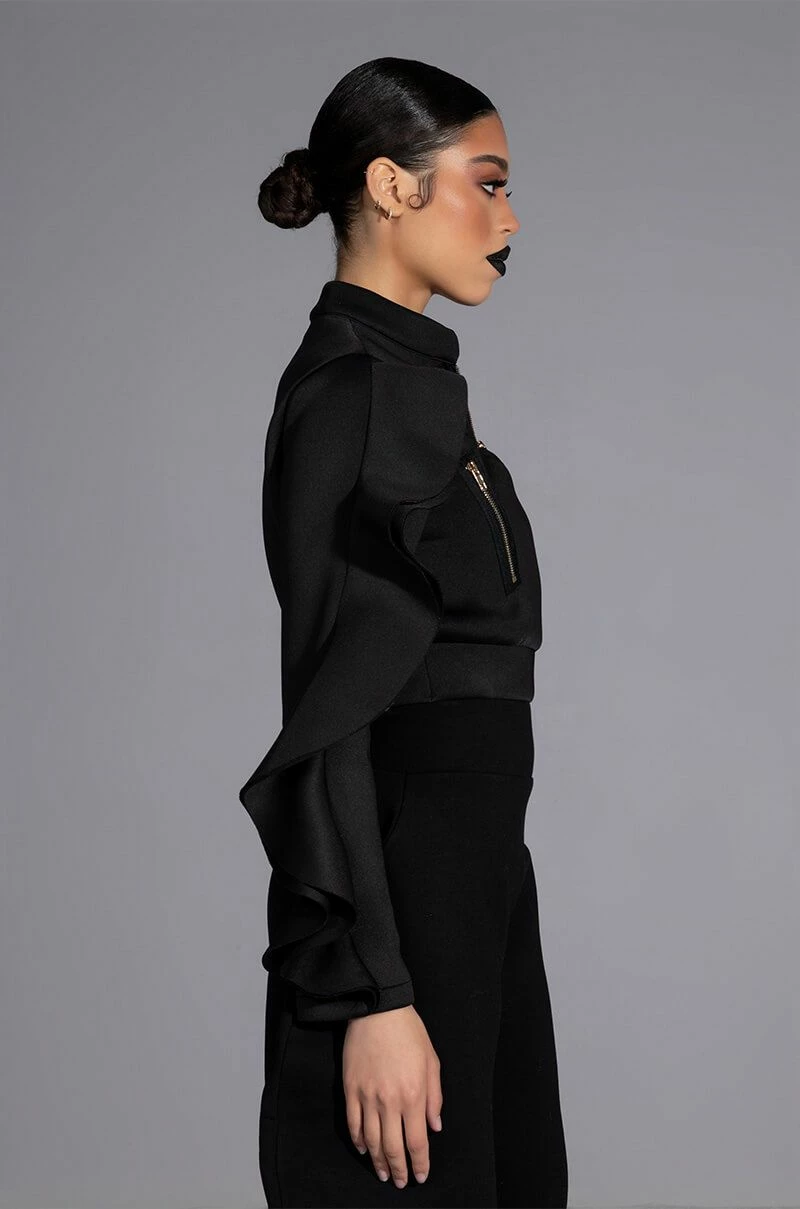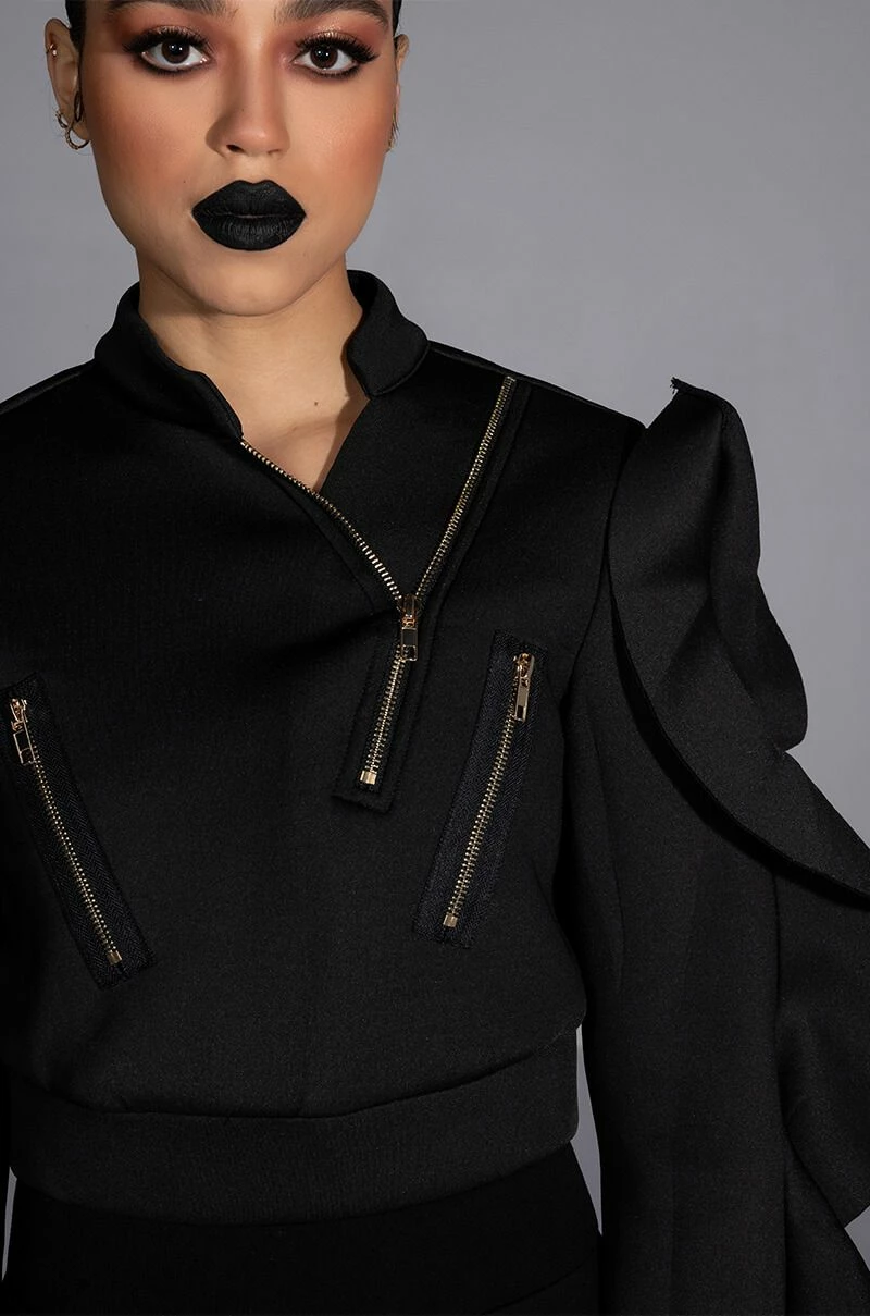 Prepare for any scenario in The AKIRA Label Ready For Anything Statement Sleeve Zippered Scuba Top. This unique sweater features a scuba knit fabrication, long sleeves, ruffle trim detailing, an asymmetrical half zip neckline, a slightly cropped cut, and dual zip front pocket. Style with high rise leggings and pumps for a complete look.