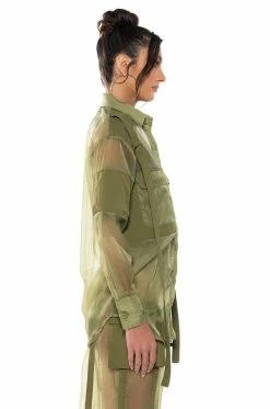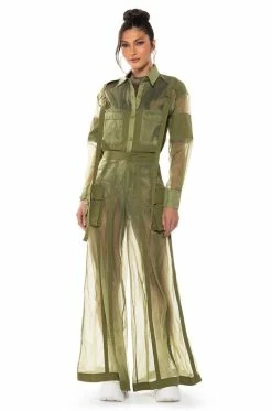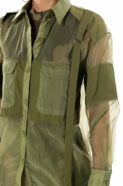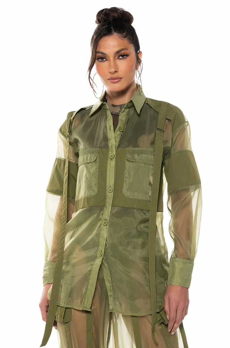 The AKIRA Label Sage Button Down Shirt is part of a flowy chic two-piece set, made from a sheer, polyester base fabrication and featuring a mesh paneling design, a foldover pointed collar, buckled cargo flap pockets with strap detail, long sleeves with buttoned cuffs, and long line silhouette. Complete with a button down front closure. Style with the coordinating bottoms, The AKIRA Label Sage Wide Leg Trouser, for a finished look.