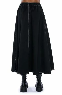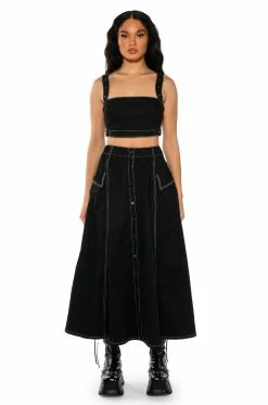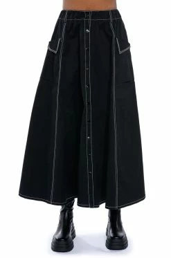 The AKIRA Label Secret Admirer Denim Maxi Skirt is a structured denim maxi skirt featuring a wide elastic waistband, dual front pockets, contrast seam detailing, and functional pop button closures down the front and sides. Style this skirt with a bodysuit for a unique look!