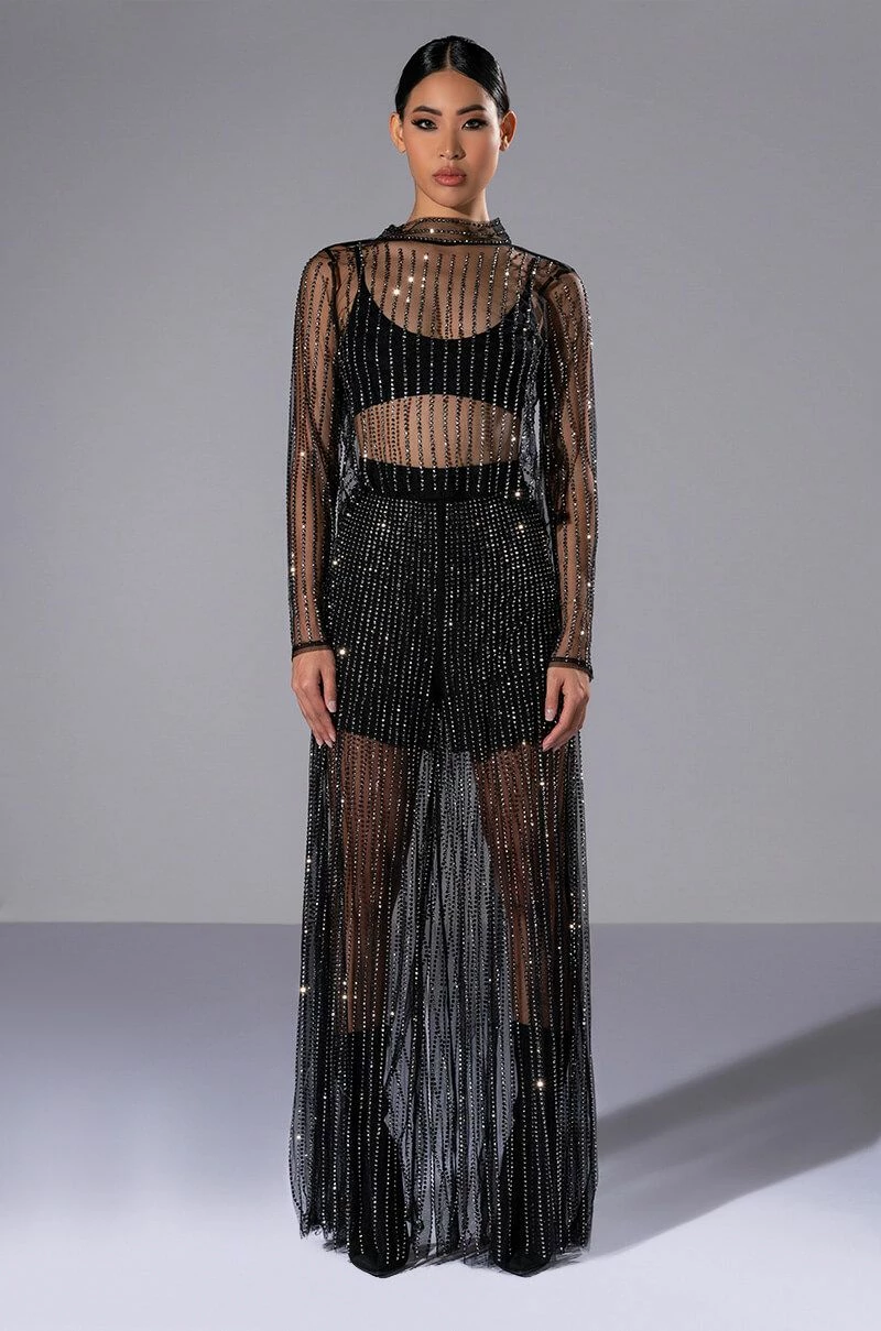 We’re in LOVE with The AKIRA Label Glam Night Out Long Sleeve Embellished Top! This elegant top is part of a bling’d up two-piece set, and features a mesh base fabrication with striped rhinestone embellishments. Complete with a mock neckline, long sleeves, a delicate button closure at the back neck, and a gorgeous open back. Finish off the look with a lacey bralette and the matching pants, The AKIRA Label Glam Night Out Mesh Wide Leg Pants.