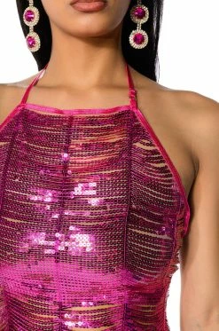 The AKIRA Label Senorita Embellished Halter Top In Pink is made from an iridescent, unlined sequin link fabrication, featuring a halter neck silhouette, an adjustable halter strap, and a sexy, cascading sequin embellished design. Complete with a gorgeous open back and two metallic faux silver adjustable lobster claw chain closures. Pair this piece with the coordinating AKIRA Label Senorita Embellished Straight Leg Pant and heels to complete the look.