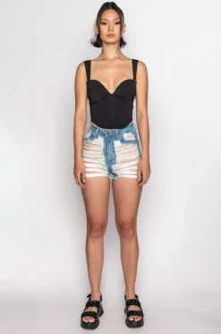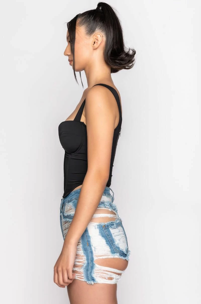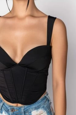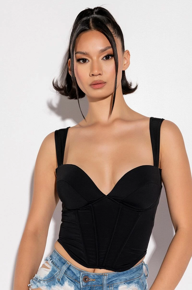 The AKIRA Label Smoke Signals Corset Tank is made from a slick and stretchy fabrication and features wide tank straps, a sweetheart neckline with padded cups, a corset bodice with boning for structure, a rounded hem, and an exposed back zipper closure.