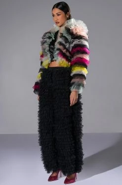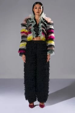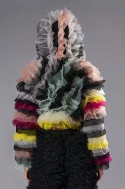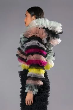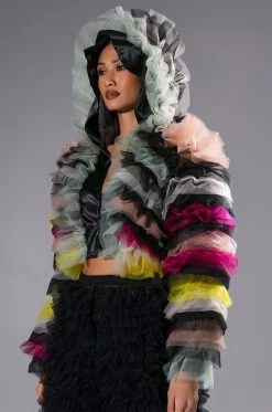 Lift your spirits with The AKIRA Label Happier Than Ever Layered Ruffle Statement Blouse. This festive piece features a sheer mesh base, satin trim, an attached hood, a cropped silhouette, and an open front design. Complete with long sleeves and layered dramatic ruffle detailing.
