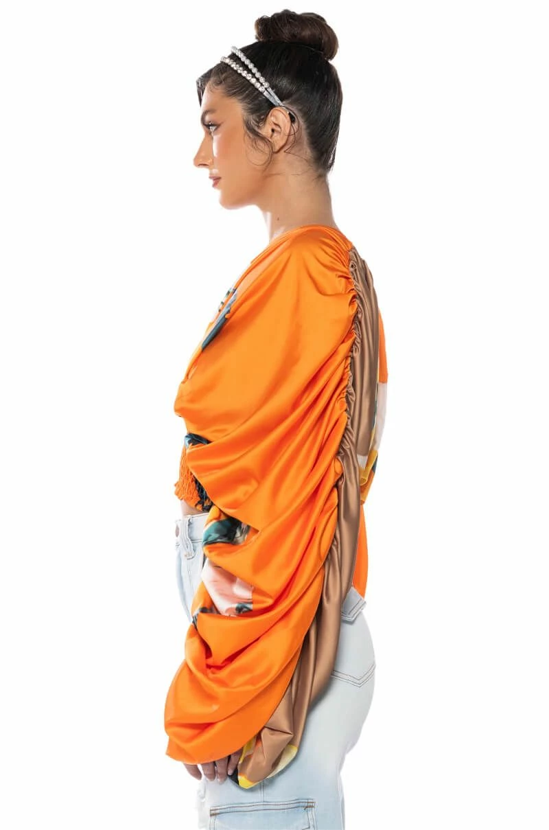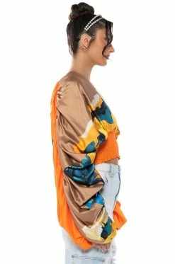 Show yourself off in The AKIRA Label Stella Print Long Sleeve Satin Blouse! This top is made from a luxe, satin base fabrication and features a plunging neckline with ruched long sleeves and shoulders. Complete with a colorful abstract print and a shirred elastic waistband. Pair with straight leg denim pants and heeled boots for an effortlessly chic look!